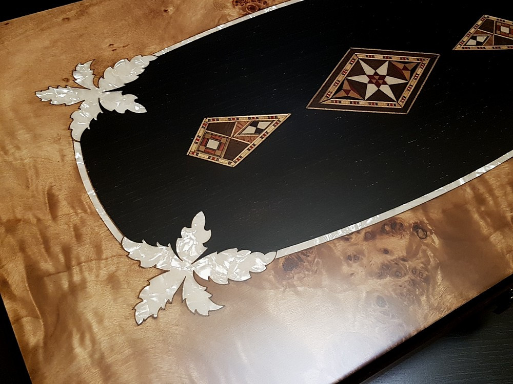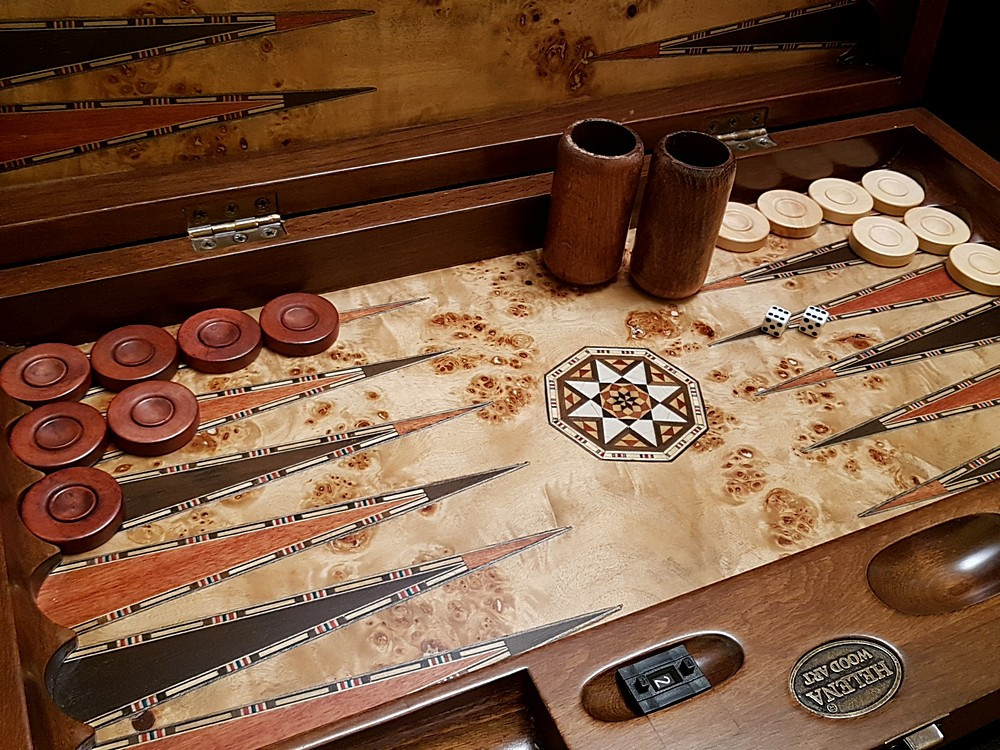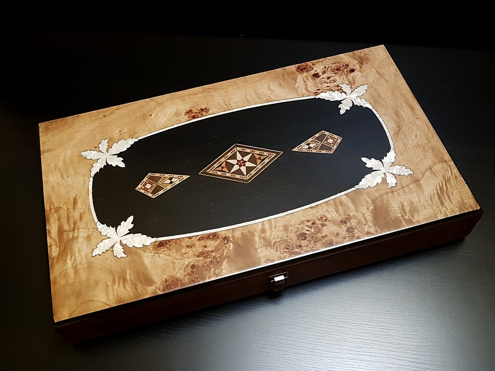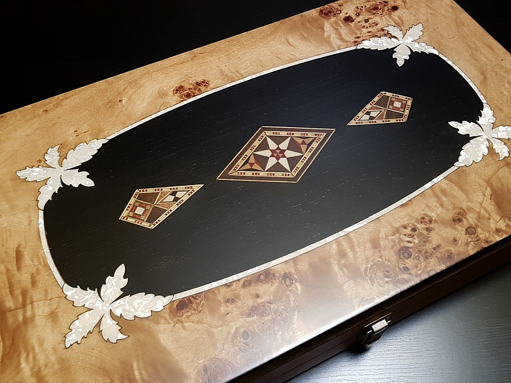 Подарочные нарды турецкой фабрики Helena Wood Art. Выполнены из древесины бука, отделаны шпоном венге и шпоном клена "птичий глаз", украшены узором из натурального перламутра. В комплект входят: игровая доска, резные фишки из самшита (d35 мм) - 30 шт., пластиковые зари - 2 шт., деревянные стаканчики - 2 шт., фирменная сумка-чехол. Размер в сложенном виде - 52х30х7 см, в разложенном - 52х60х3,5 см.