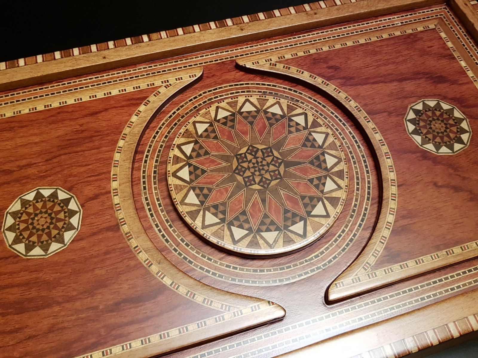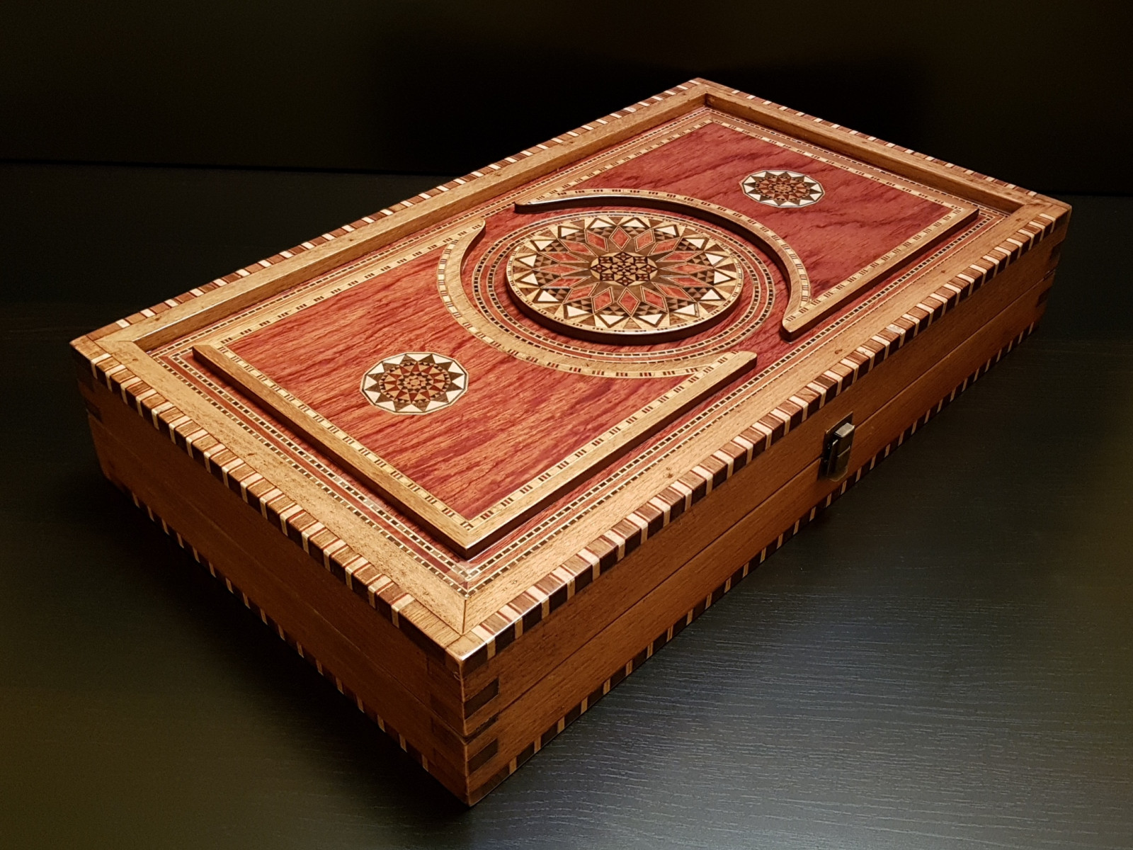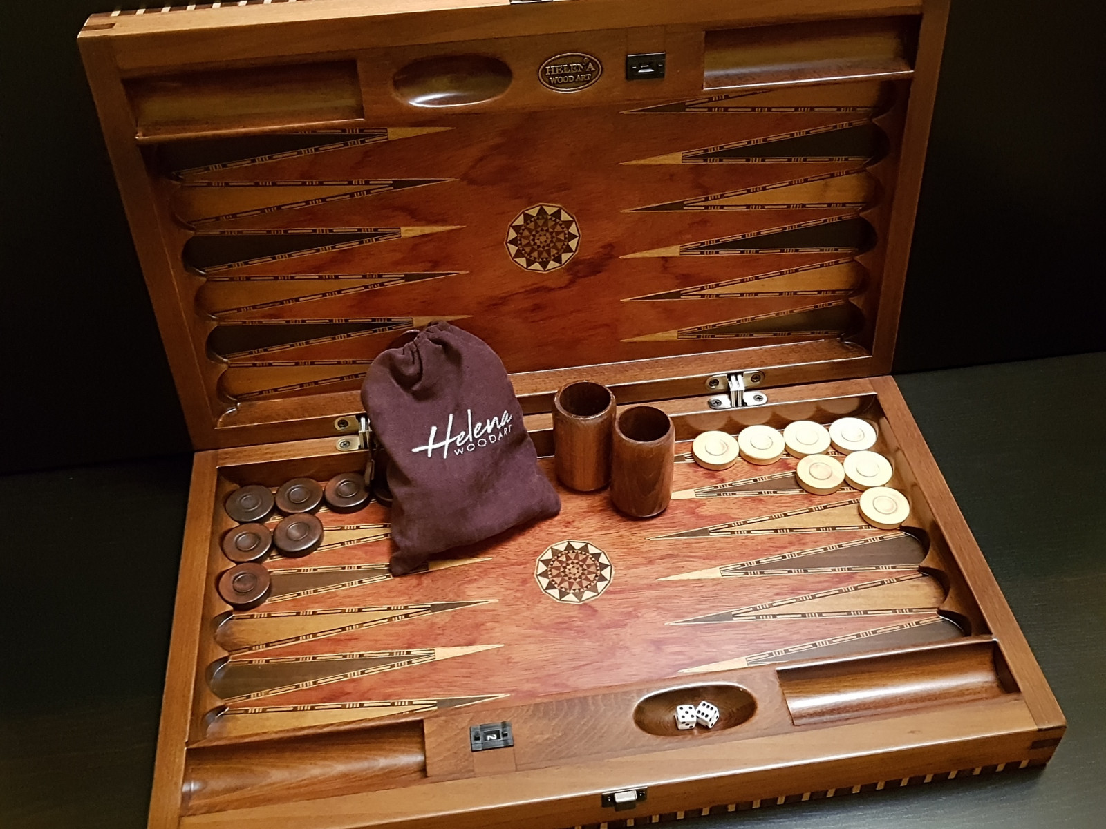 Эксклюзивные подарочные нарды ручной работы в стиле антик. Выполнены из древесины бука и инкрустированы вставками из различных пород дерева. Основная отделка - шпон дерева махагон. В комплект входят: игровая доска, резные фишки из самшита (d35 мм) - 30 шт., пластиковые зари - 2 шт., деревянные стаканчики - 2 шт., кожаная сумка-чехол. Размер в сложенном виде - 52х30х9 см, в разложенном - 52х60х4,5 см.