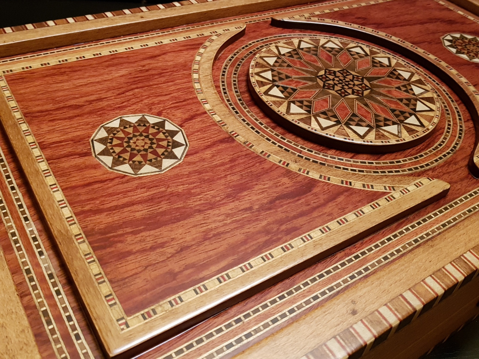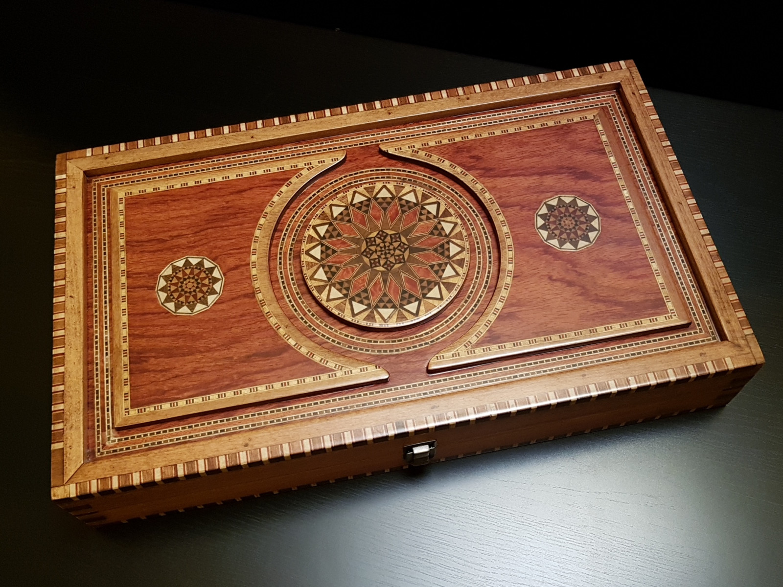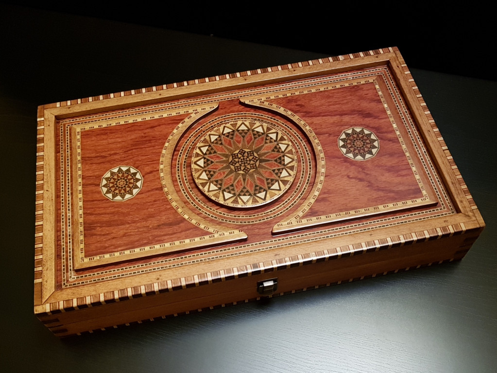 Эксклюзивные подарочные нарды ручной работы в стиле антик. Выполнены из древесины бука и инкрустированы вставками из различных пород дерева. Основная отделка - шпон дерева махагон. В комплект входят: игровая доска, резные фишки из самшита (d35 мм) - 30 шт., пластиковые зари - 2 шт., деревянные стаканчики - 2 шт., кожаная сумка-чехол. Размер в сложенном виде - 52х30х9 см, в разложенном - 52х60х4,5 см.