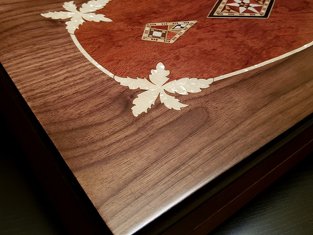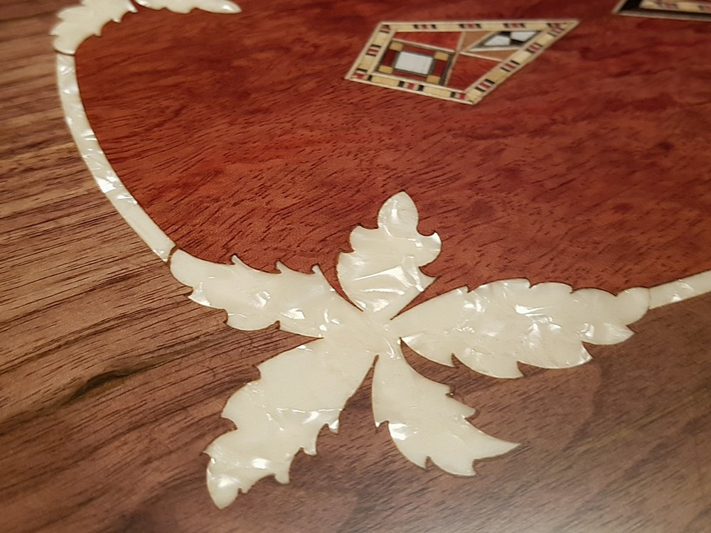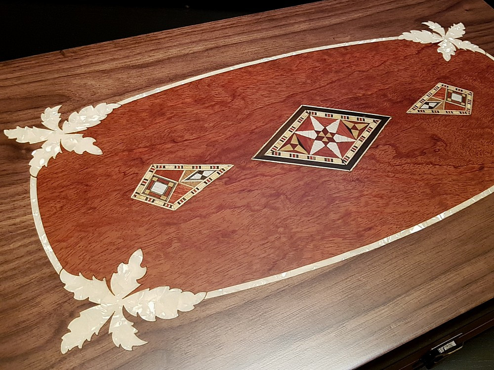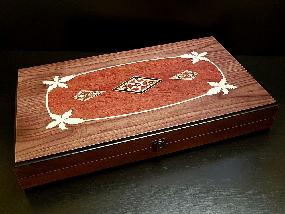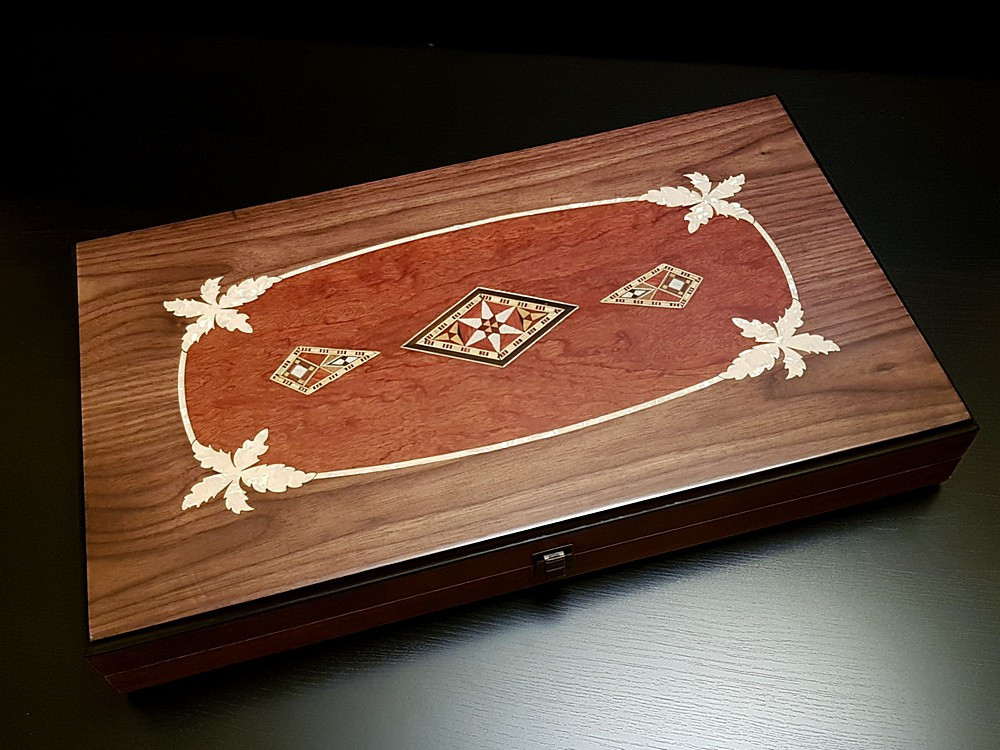 Подарочные нарды турецкой фабрики Helena Wood Art. Выполнены из древесины бука, отделаны шпоном ореха и розы, украшены узором из натурального перламутра. В комплект входят: игровая доска, резные фишки из самшита (d35 мм) - 30 шт., пластиковые зари - 2 шт., деревянные стаканчики - 2 шт., фирменная сумка-чехол. Размер в сложенном виде - 52х30х7 см, в разложенном - 52х60х3,5 см.