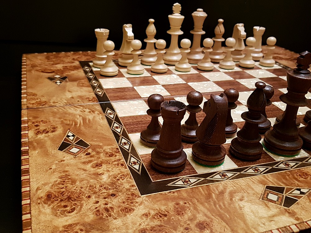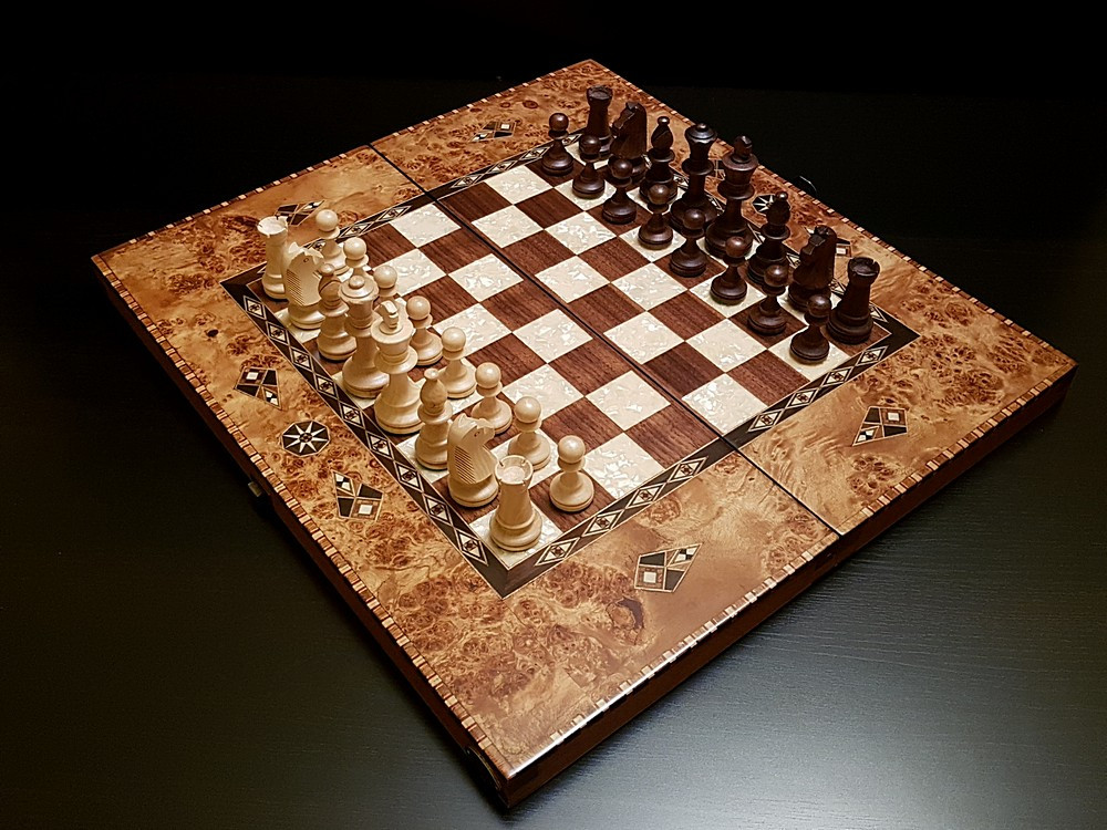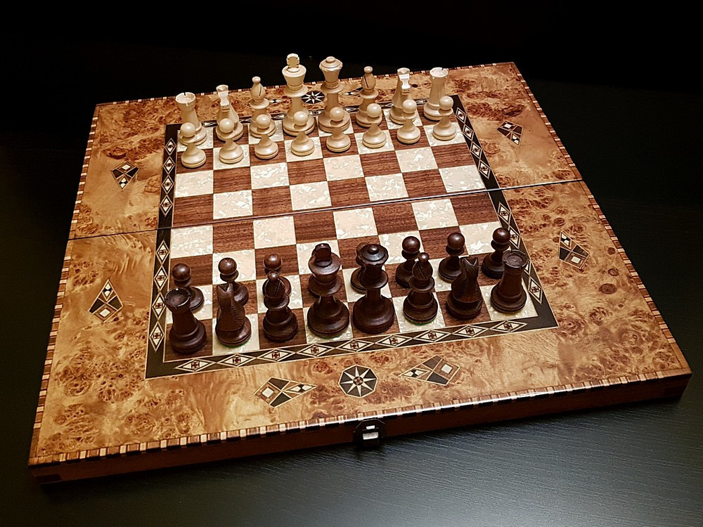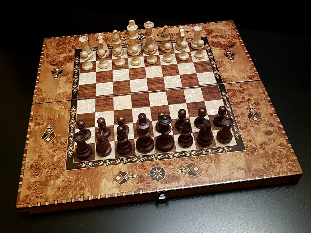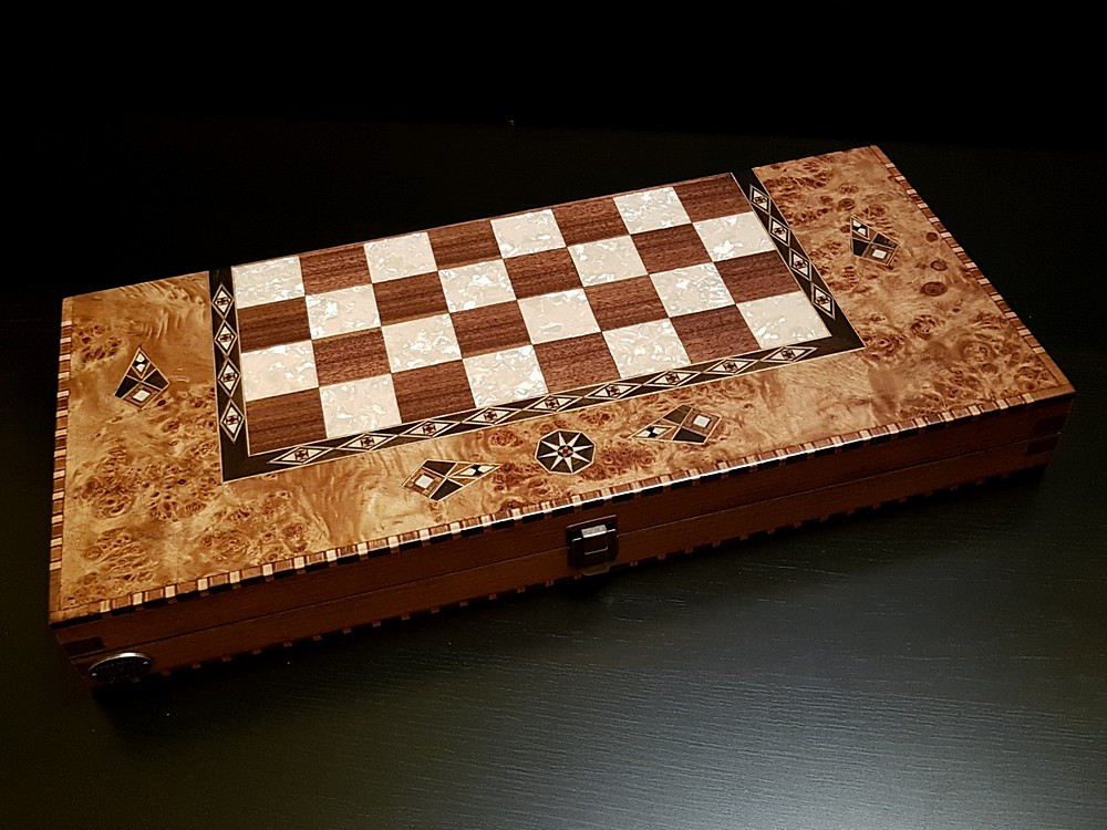 Подарочные шахматы-нарды в стиле антик, украшенные инкрустацией. Выполнены из бука и инкрустированы вставками из различных пород дерева. Основная отделка - шпон клена "птичий глаз". В комплект входят: доска, деревянные утяжеленные шахматные фигуры, фишки из самшита для игры в нарды, зари пластиковые - 2 шт. Размер в сложенном виде - 50х23х6 см, в разложенном - 50х46х3 см.
