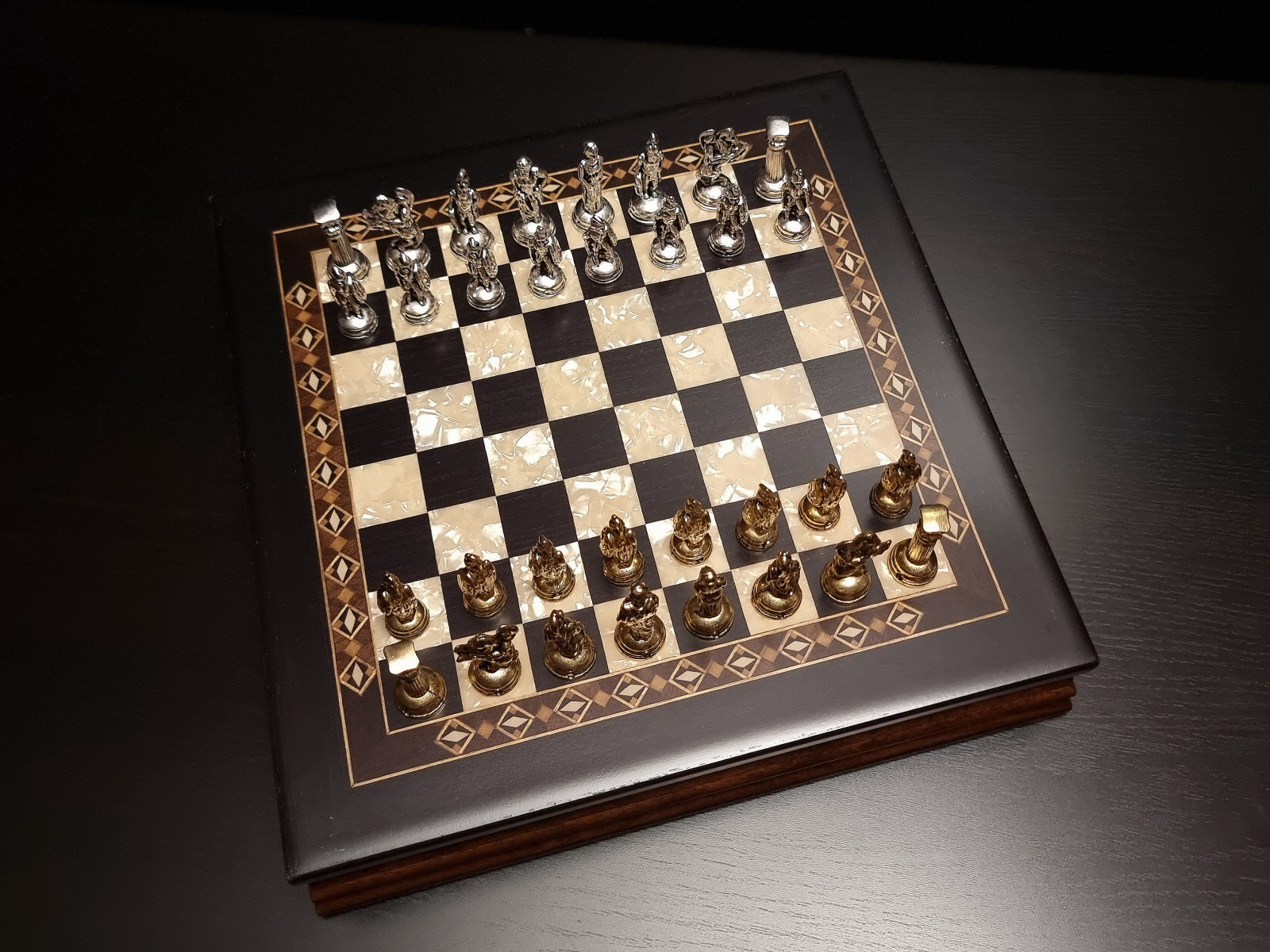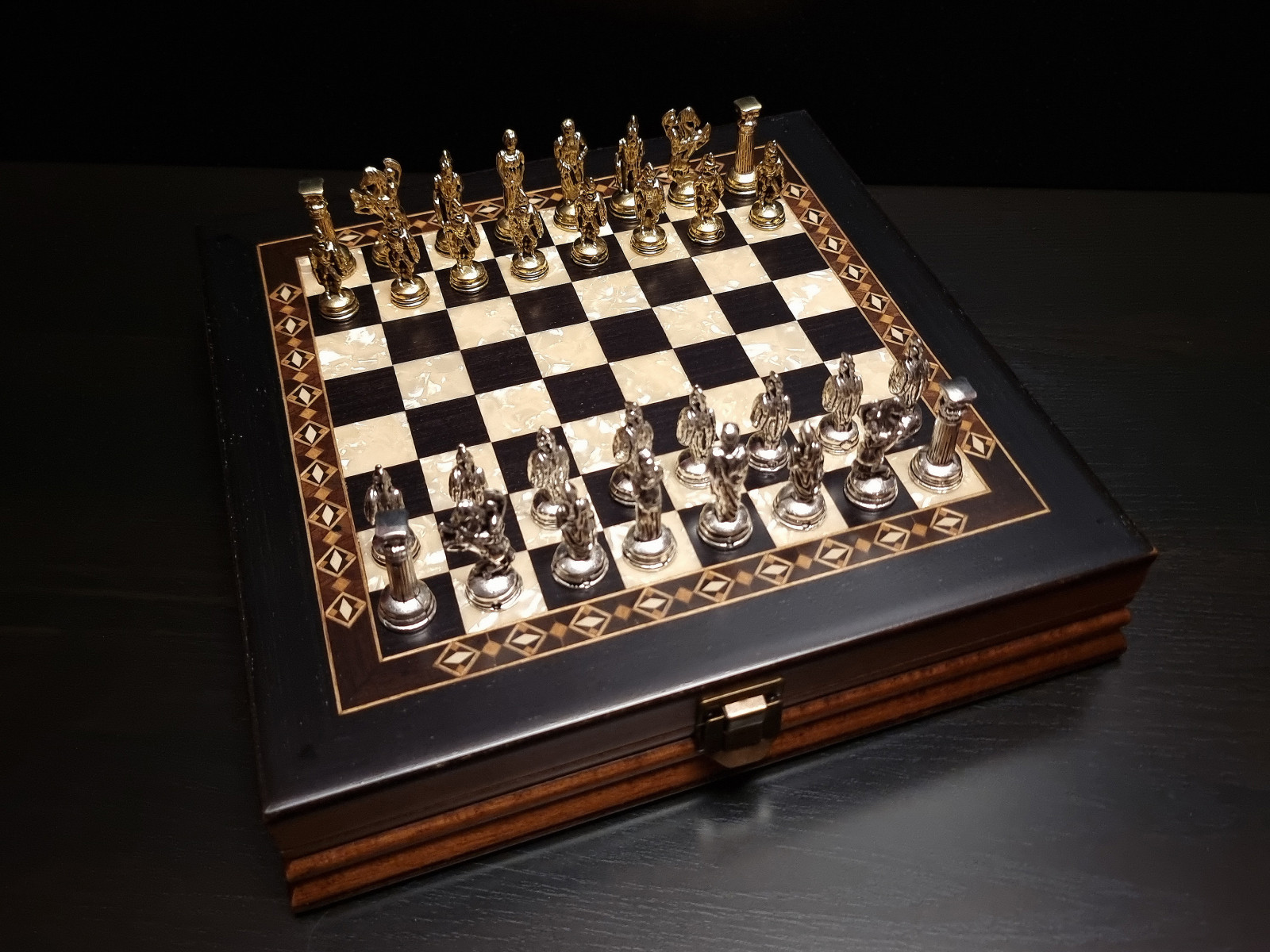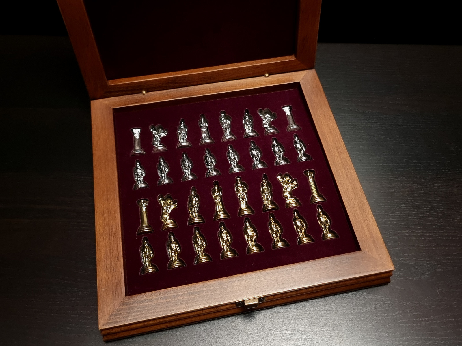 Подарочные шахматы с бронзовыми литыми фигурами. Отделаны шпоном венге в стиле "антик". В комплект входят: доска-ларец, бронзовые фигуры (цвет - золото/серебро), сумка-чехол.