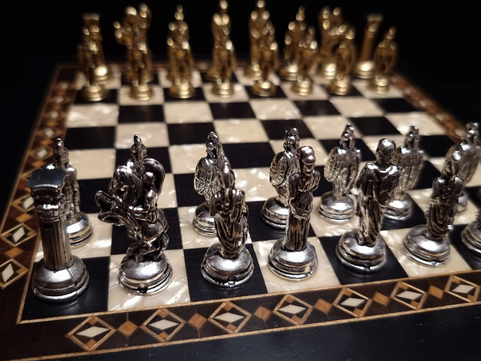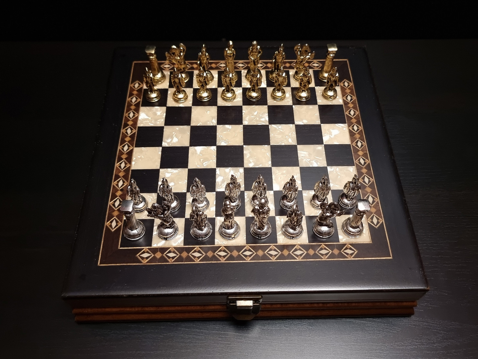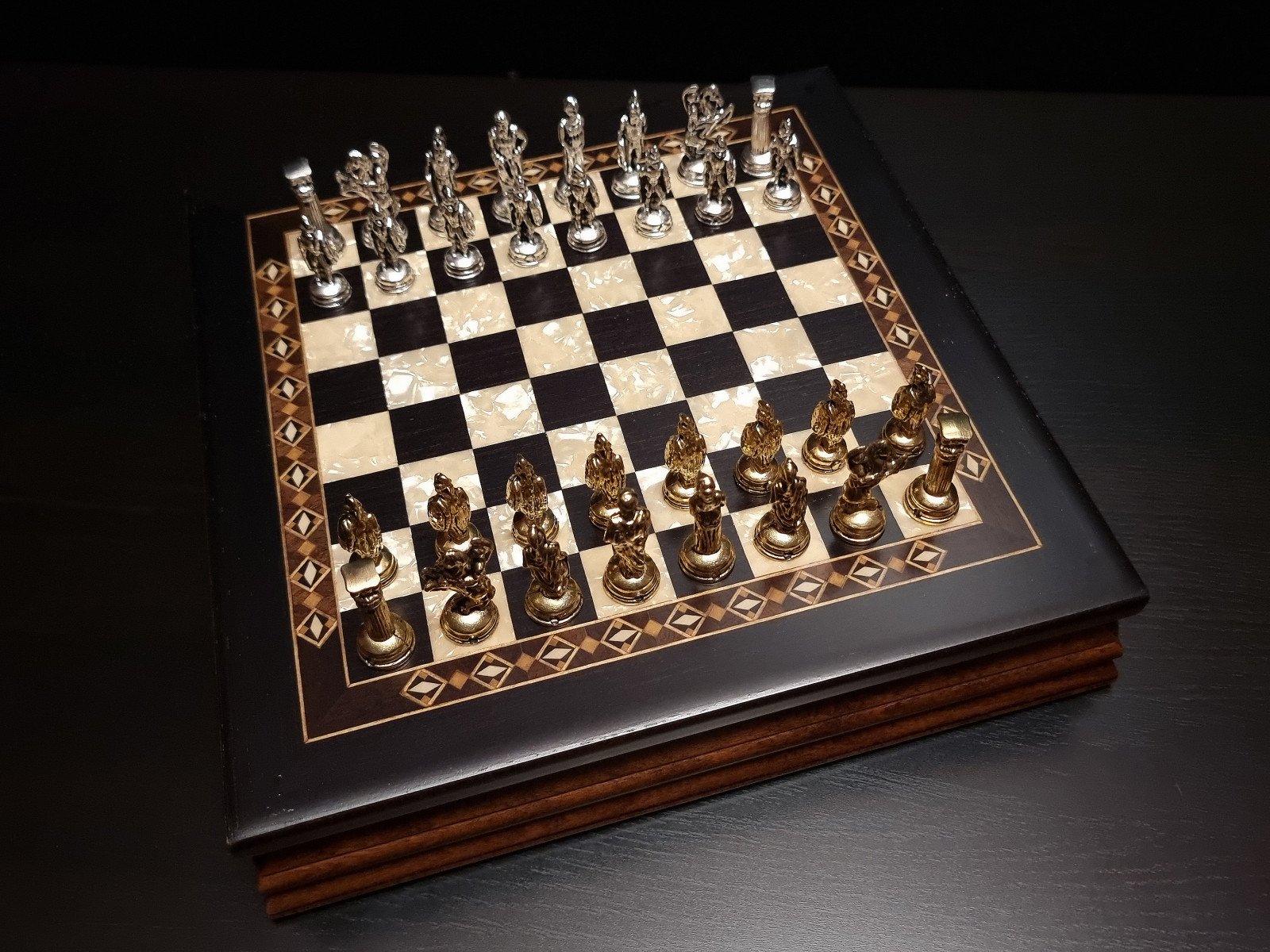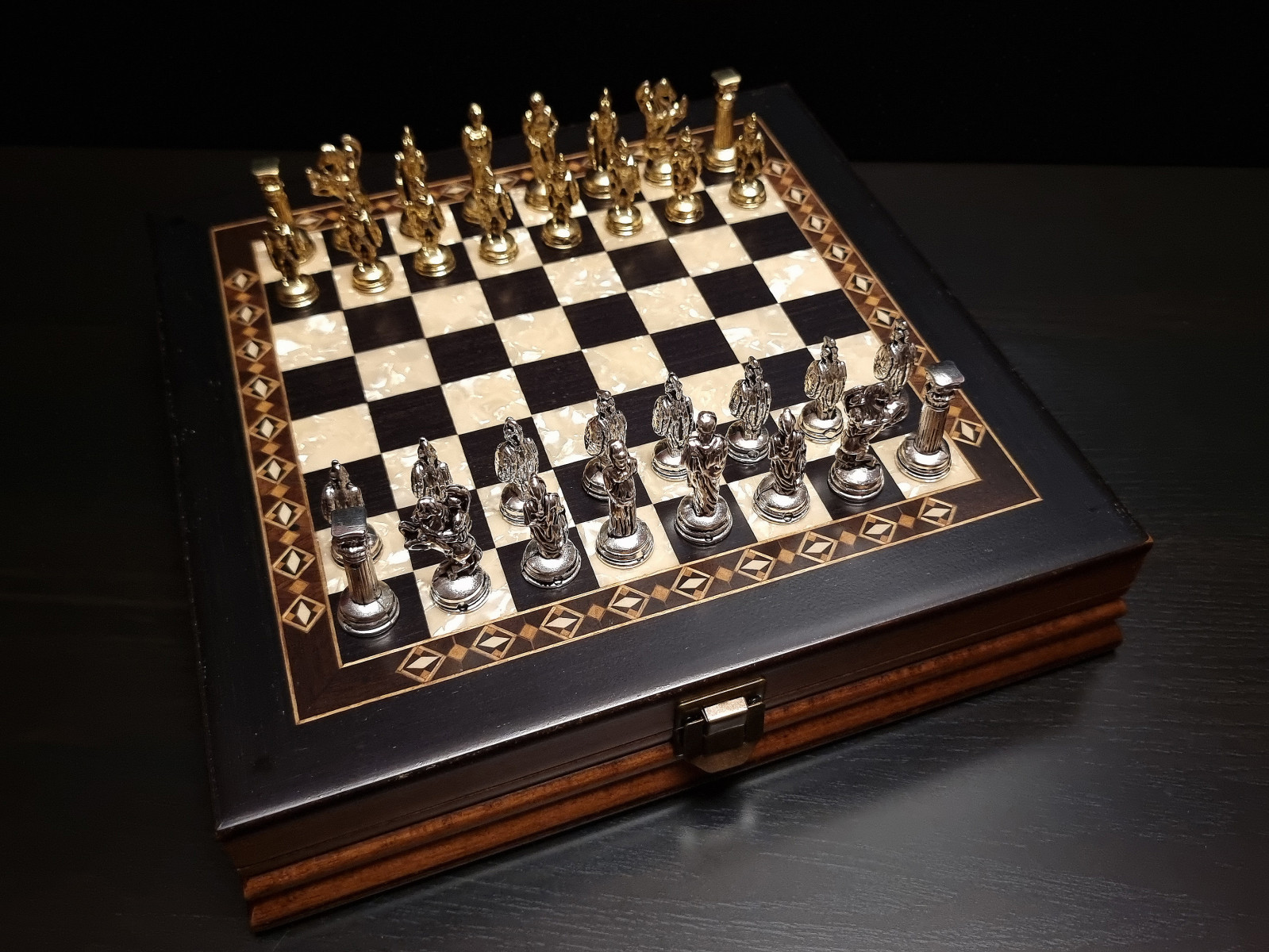 Подарочные шахматы с бронзовыми литыми фигурами. Отделаны шпоном венге в стиле "антик". В комплект входят: доска-ларец, бронзовые фигуры (цвет - золото/серебро), сумка-чехол.