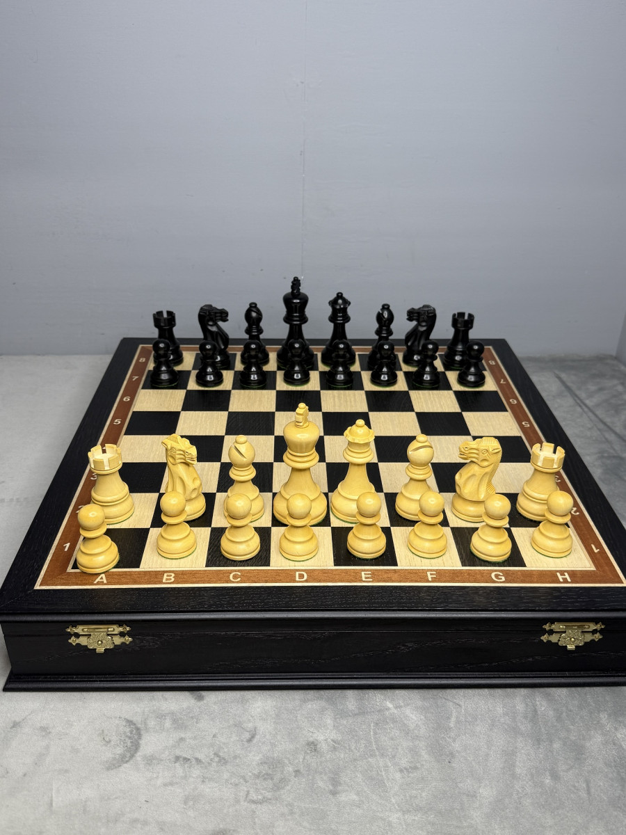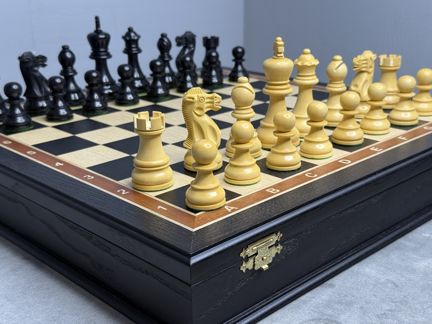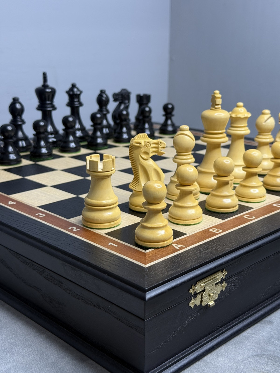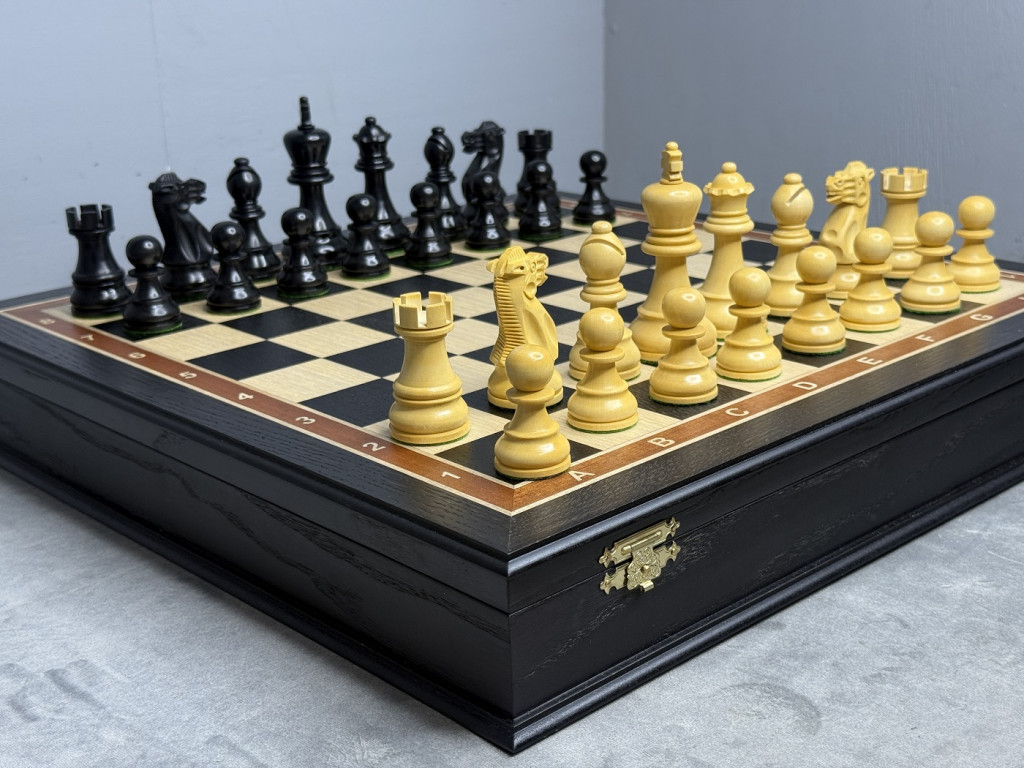 Шахматы подарочные в ларце с фигурами из самшита и палисандра черные люкс