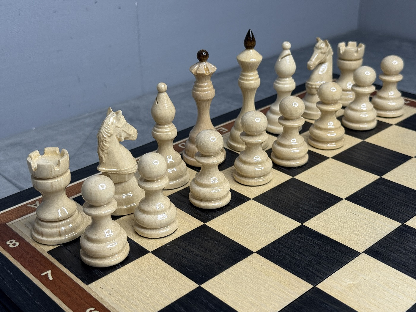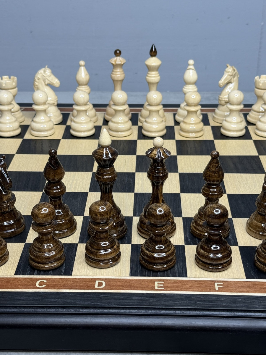 Утяжелённые фигуры выполнены из клёна, имеют классические пропорции, устойчивое основание с бархатной накладкой и удобно лежат в руке. Благодаря утяжелению фигуры стоят на клетках уверенно и обеспечивают комфортную, плавную игру.