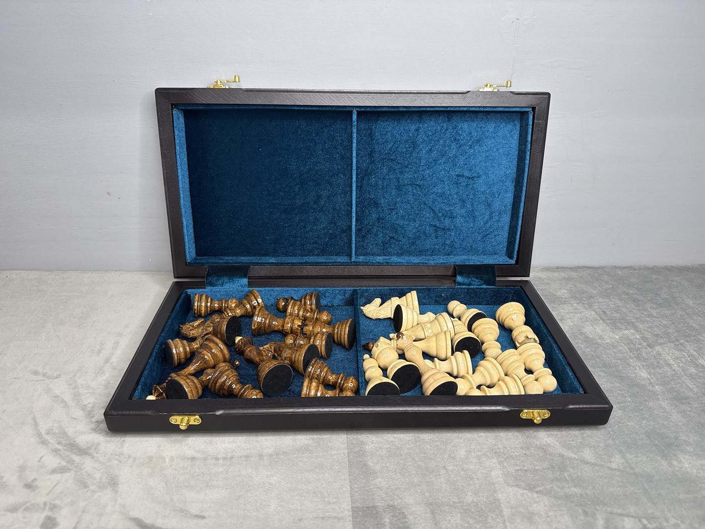 Внутреннее пространство доски отделано мягким бархатом для безопасного хранения фигур.