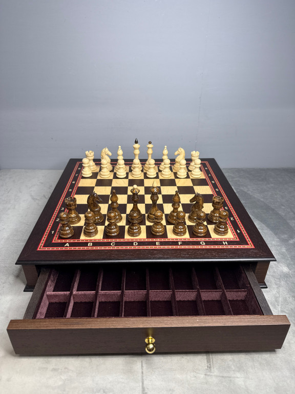 Корпус выполнен из массива дуба — прочного, устойчивого и долговечного дерева. Крышка шахматной доски оформлена в технике маркетри: каждая клетка сформирована из отдельных элементов шпона венге и клёна, создавая идеальный рисунок без зазоров и перепадов.