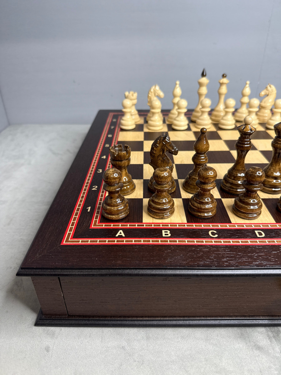 Разметка поля — буквенная и цифровая — выполнена из шпона красного дерева и аккуратно врезана в поверхность доски. Это не печать и не наклейка, а настоящая инкрустация.