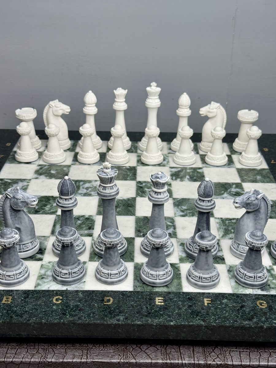 Набор для игры в шахматы изготовлен вручную, доска нескладная из натурального камня, шахматные фигуры из искусственного мрамора.