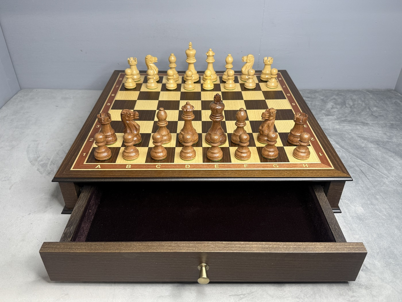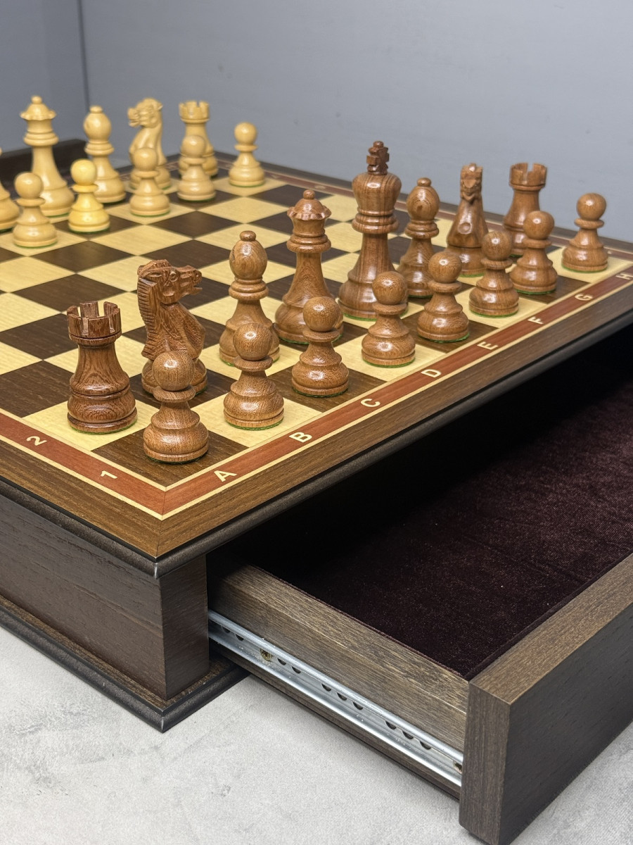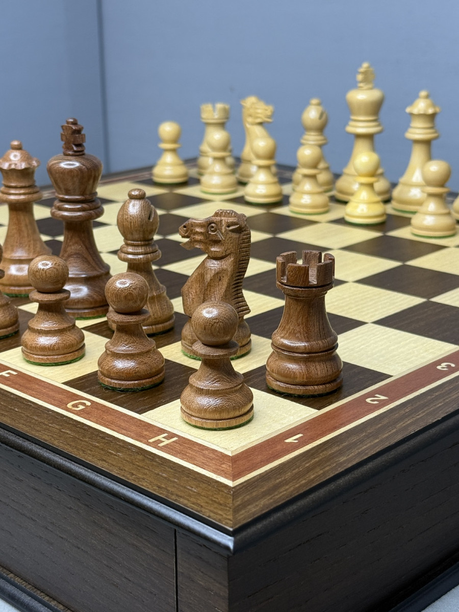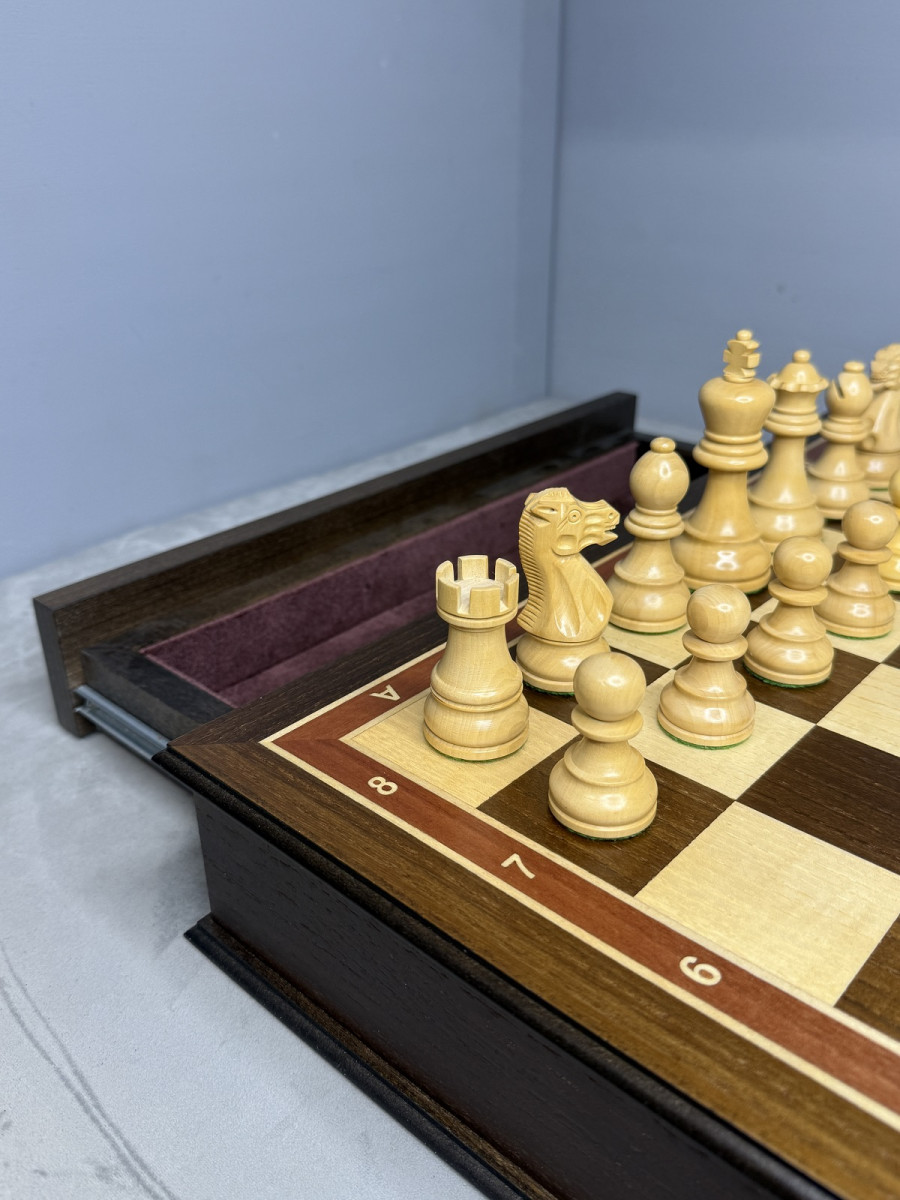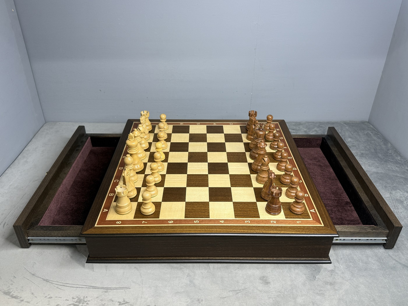 Техника выполнения и обработки ларца: шахматный ларец выполнен из ценных пород дерева с применением техники маркетри. Ларец оснащён декоративны замком из сувенирной стали, а также надёжными петлями, что значительно увеличивает срок эксплуатации произведения мастера. Внутренняя обивка ларца итальянским бархатом с ложементом под каждую фигуру придаёт дополнительное благородство и подчёркивает статус и вкус его обладателя.