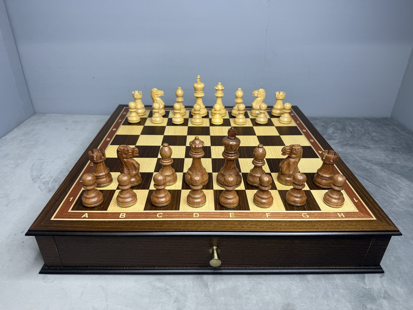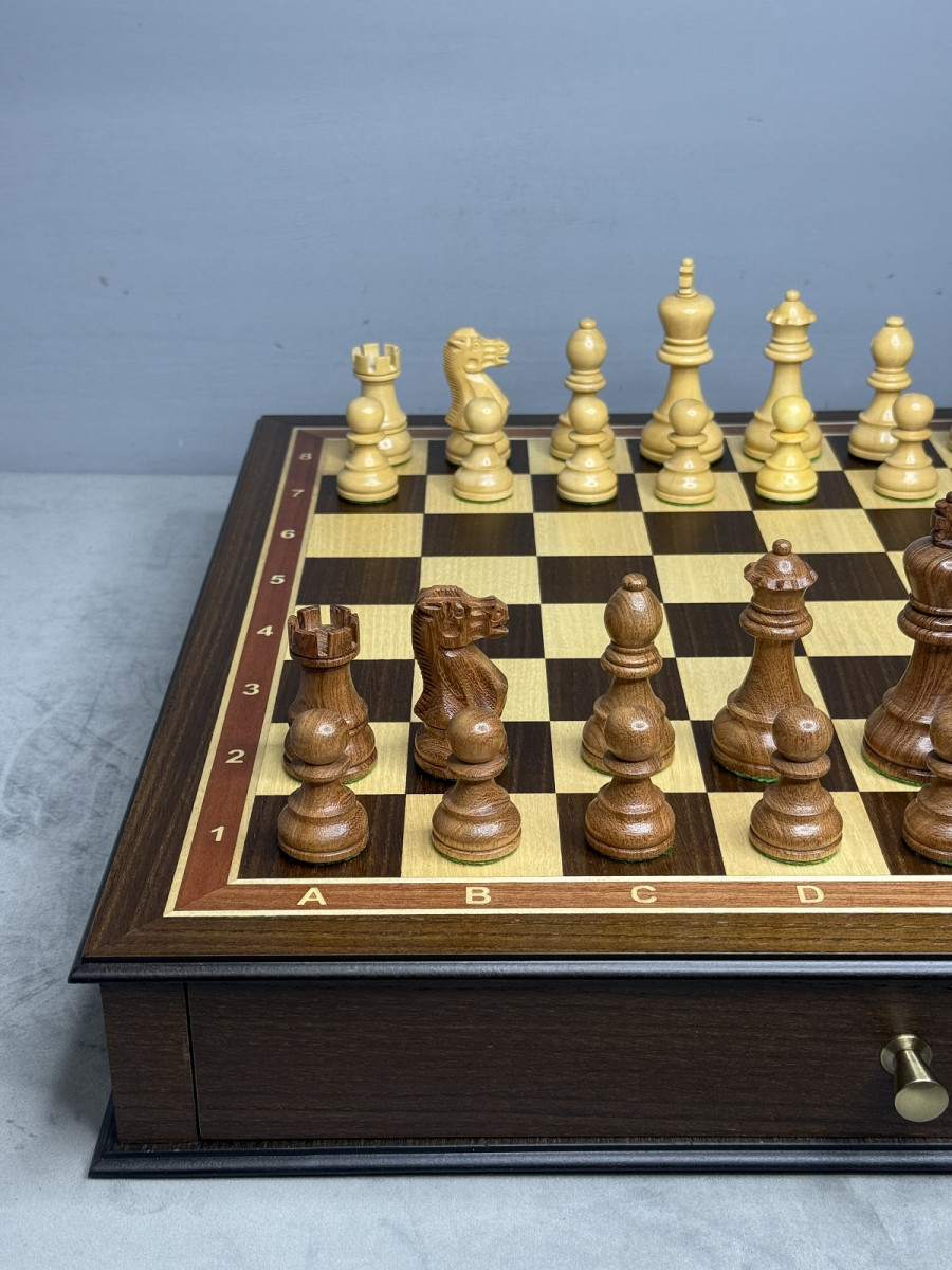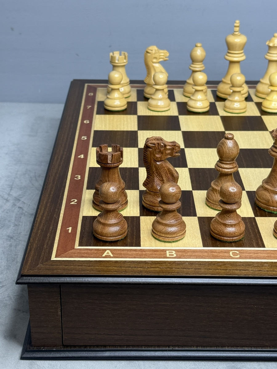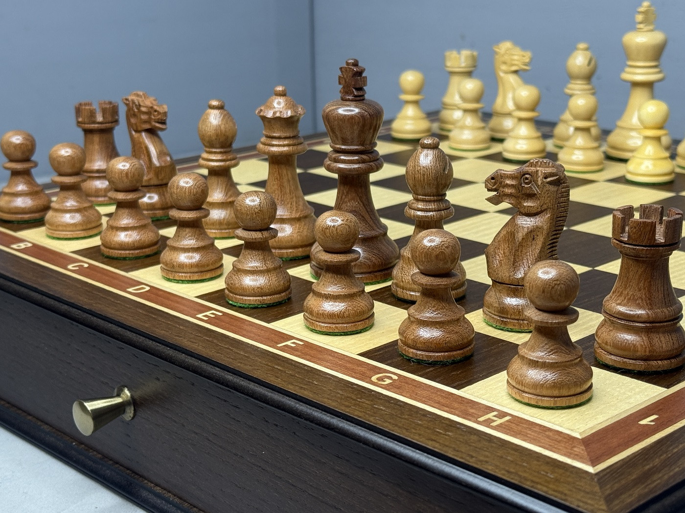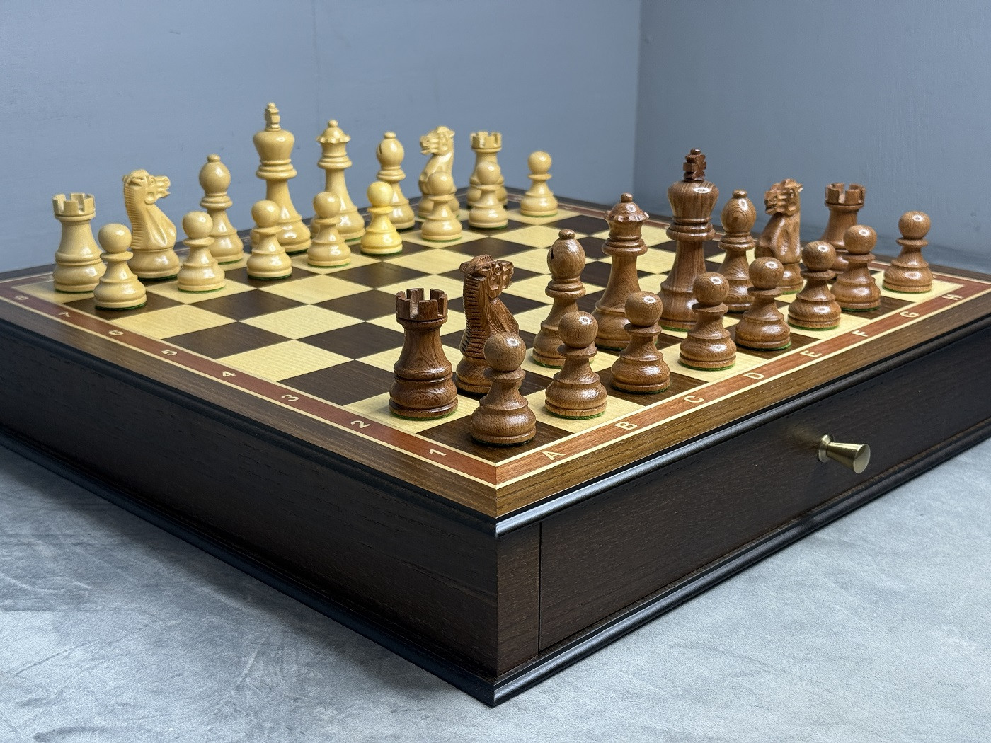 Техника выполнения и обработки ларца: шахматный ларец выполнен из ценных пород дерева с применением техники маркетри. Ларец оснащён декоративны замком из сувенирной стали, а также надёжными петлями, что значительно увеличивает срок эксплуатации произведения мастера. Внутренняя обивка ларца итальянским бархатом с ложементом под каждую фигуру придаёт дополнительное благородство и подчёркивает статус и вкус его обладателя.