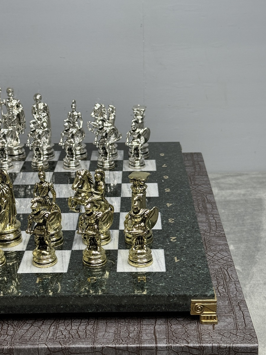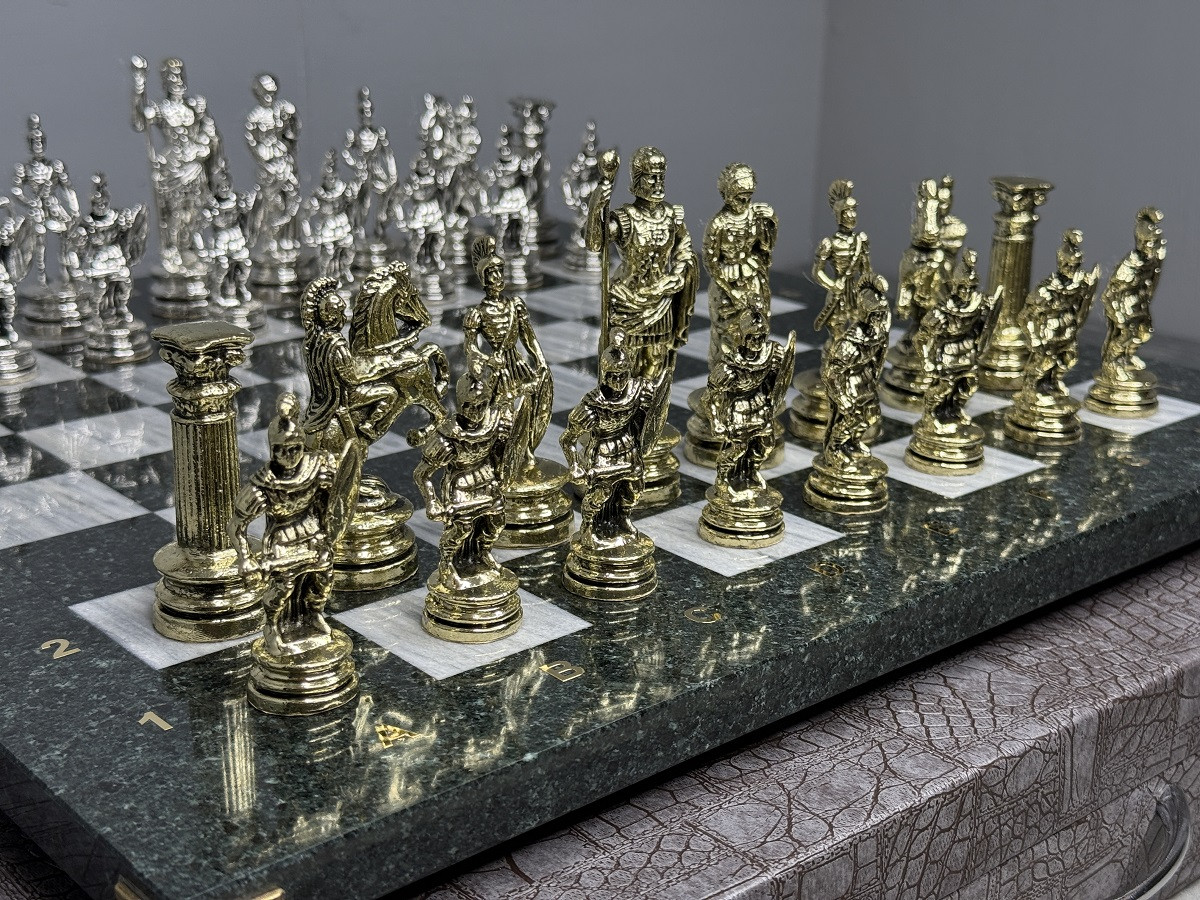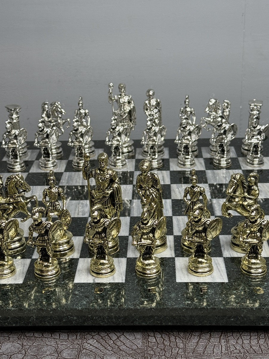 Купить шахматы из камня "Римская война" с кейсом, выполненные вручную из змеевика и мрамора. Каждый набор уникален по рисунку и оттенку, что делает его идеальным подарком для коллекционеров и ценителей эксклюзивных игр. Прочный камень и утяжелённые металлические фигуры обеспечивают комфортную игру и долговечность набора.
