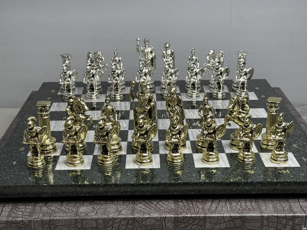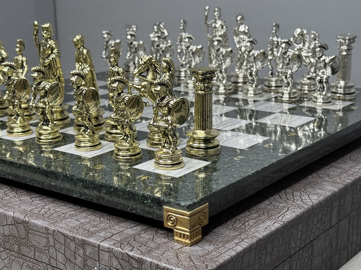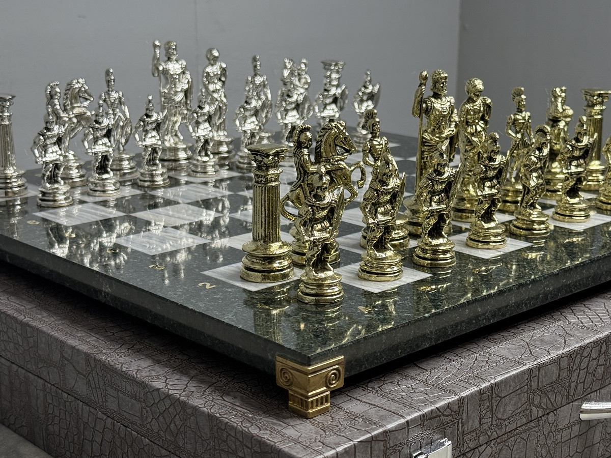 Купить шахматы из камня "Римская война" с кейсом, выполненные вручную из змеевика и мрамора. Каждый набор уникален по рисунку и оттенку, что делает его идеальным подарком для коллекционеров и ценителей эксклюзивных игр. Прочный камень и утяжелённые металлические фигуры обеспечивают комфортную игру и долговечность набора.
