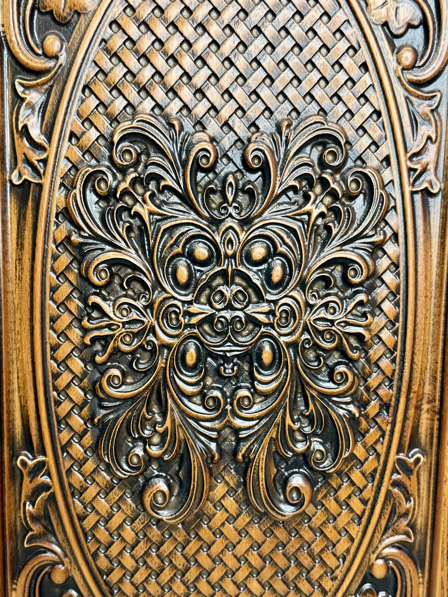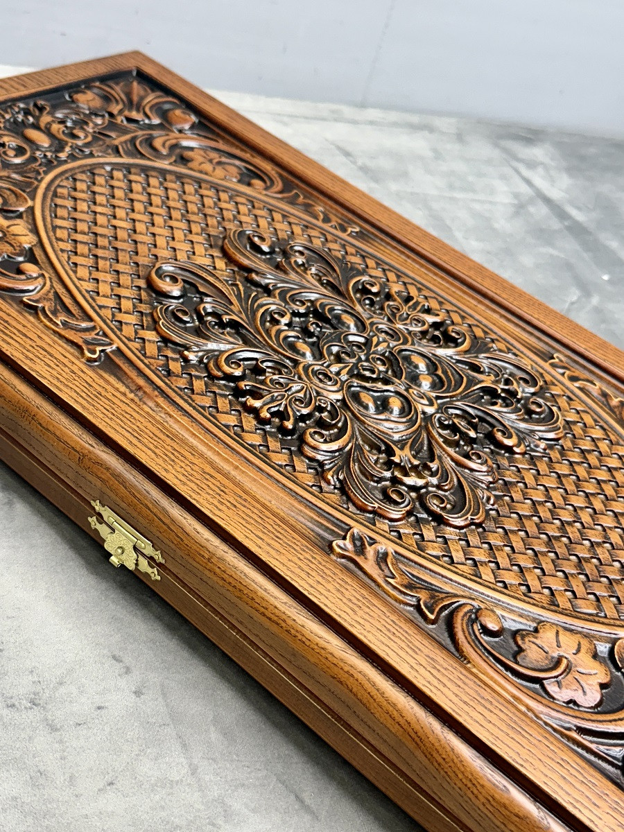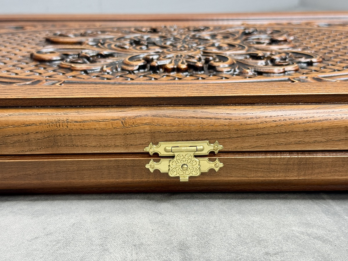 Центральная часть доски украшена резным орнаментом, придающим нардам уникальный и премиальный вид. Большая доска позволяет удобно расставлять фишки, создавая комфортную игровую зону. Идеальный подарок для ценителей настольных игр.