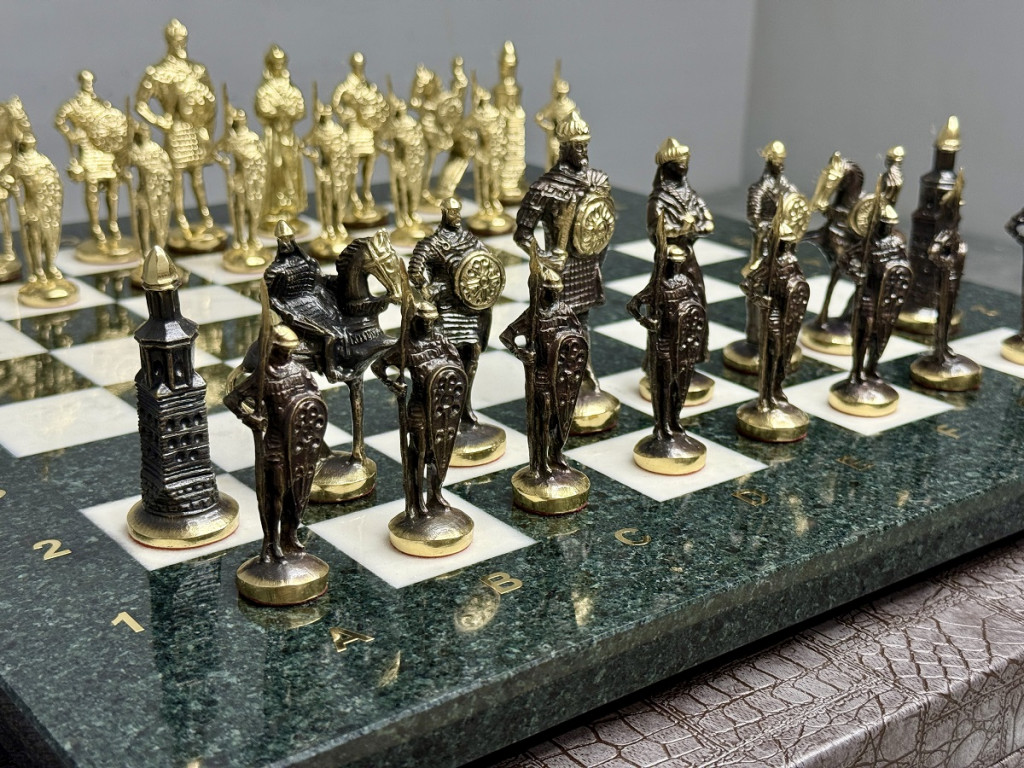 Эксклюзивный шахматный набор из камня "Русские" – идеальный подарок для ценителей настольных игр. Каждая шахматная фигура изготовлена вручную из бронзы, а доска выполнена из натурального змеевика и мрамора. Размер доски 40х40 см, высота фигур 7,5–9,5 см, вес набора 10 кг.