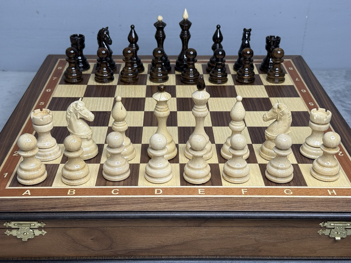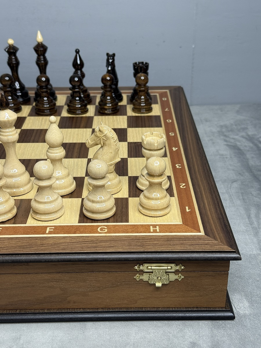 Премиальный шахматный ларец ручной работы «Гранд» из дуба со шпоном ореха, клена и красного дерева, с фигурами из клёна.