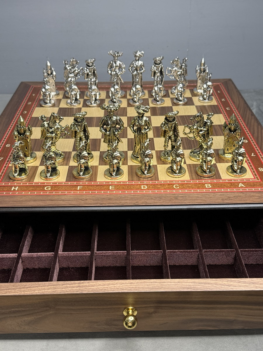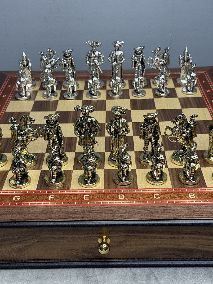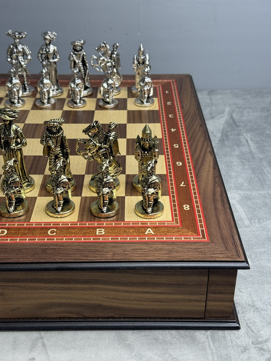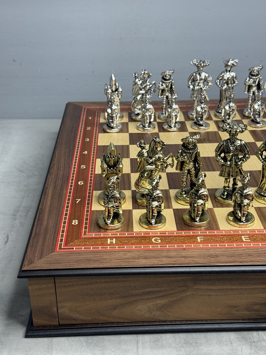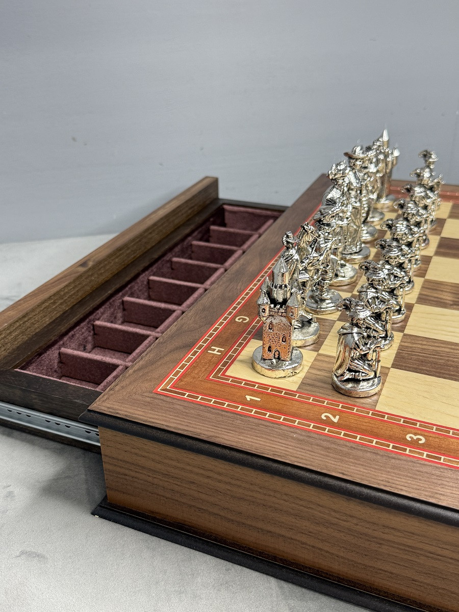 Подарочные шахматы «Средневековье» — эксклюзивный премиум набор с металлическими утяжелёнными фигурами и ларцом из массива дуба с шпоновой отделкой ореха и красного дерева. Идеальный подарок для коллекционеров и ценителей шахмат с доставкой по Москве и Московской области.