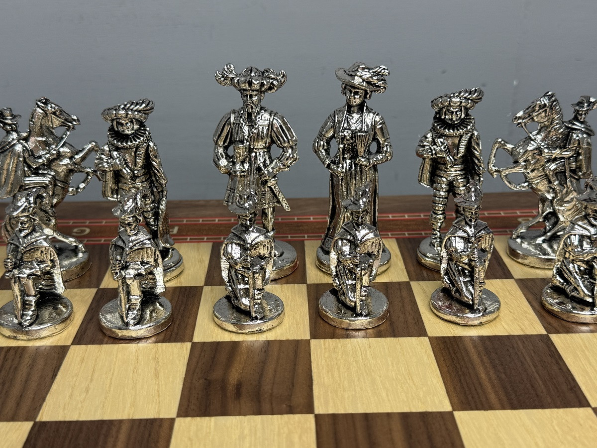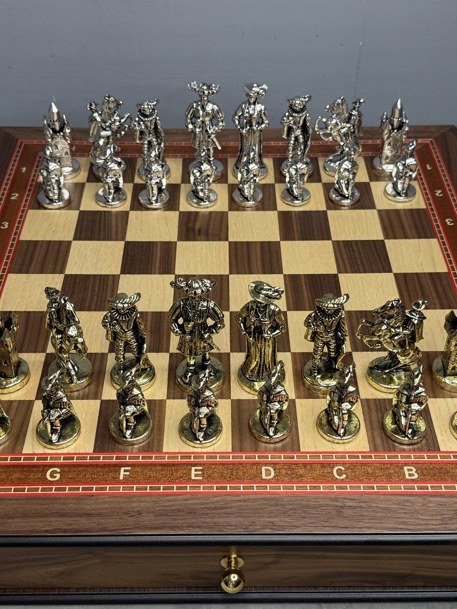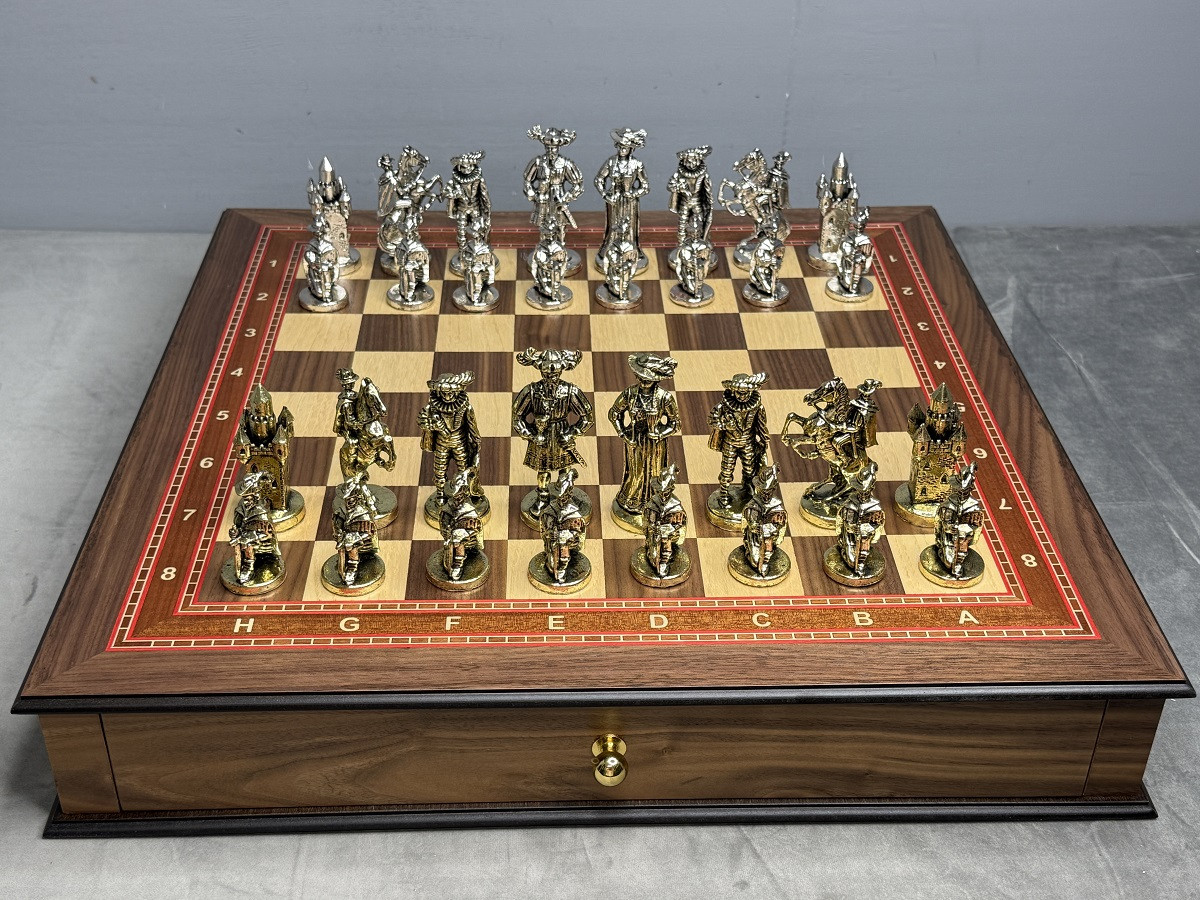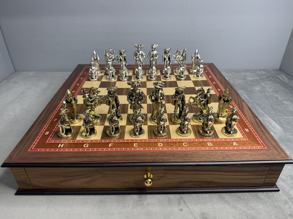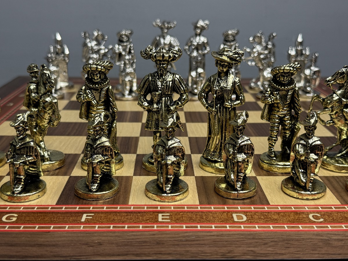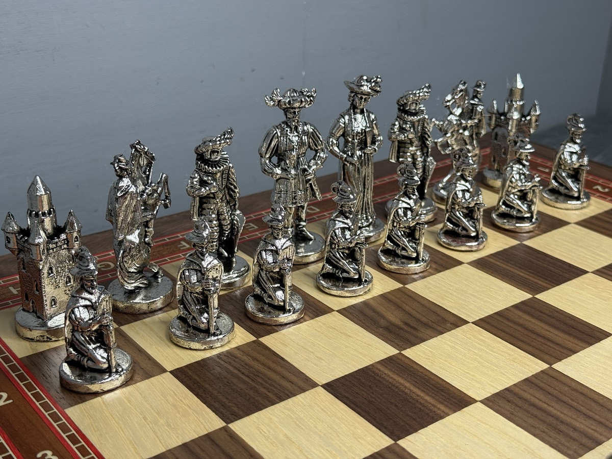 Подарочные шахматы «Средневековье» — эксклюзивный премиум набор с металлическими утяжелёнными фигурами и ларцом из массива дуба с шпоновой отделкой ореха и красного дерева. Идеальный подарок для коллекционеров и ценителей шахмат с доставкой по Москве и Московской области.