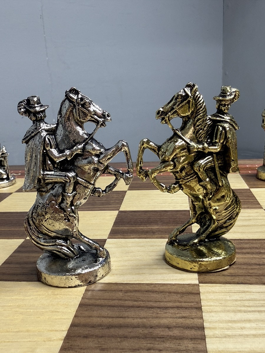 Фигуры набора выполнены из металла с утяжелением, каждая стоит на бархатной подставке.