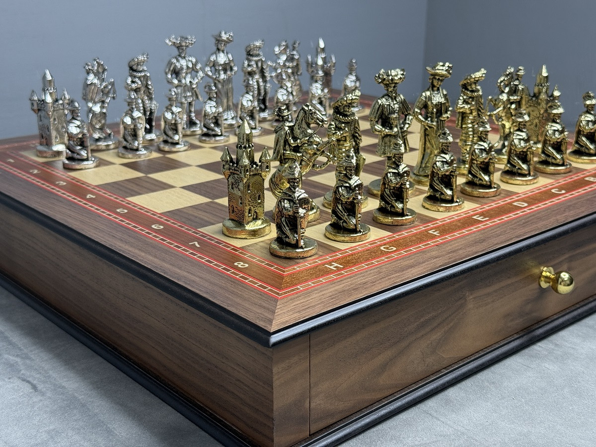 Размер шахматного ларца: 45 × 45 см Фигуры: бронза, тематические «Средневековье»