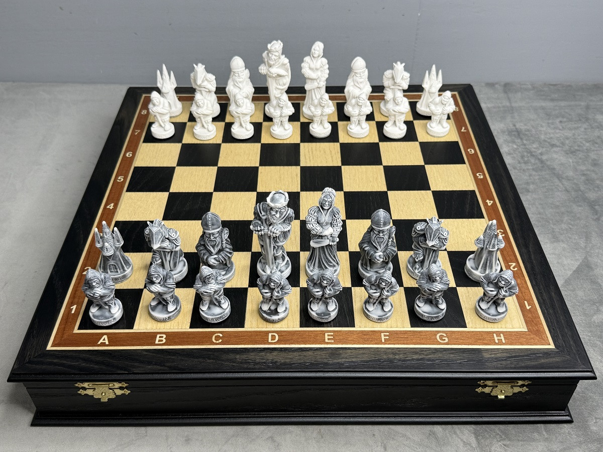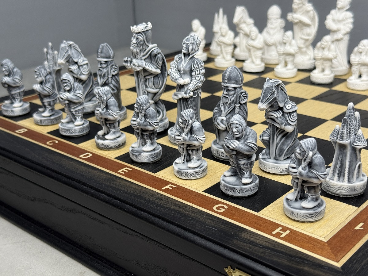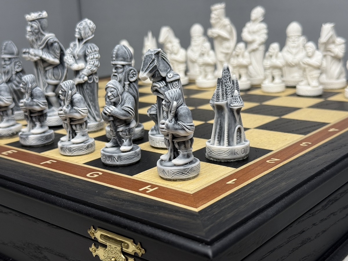 Каждая фигура создана вручную с высокой детализацией. Пешка — 5,2 см, король — 9,5 см. Тематика фигур — средневековые рыцари, что делает набор уникальным и коллекционным.