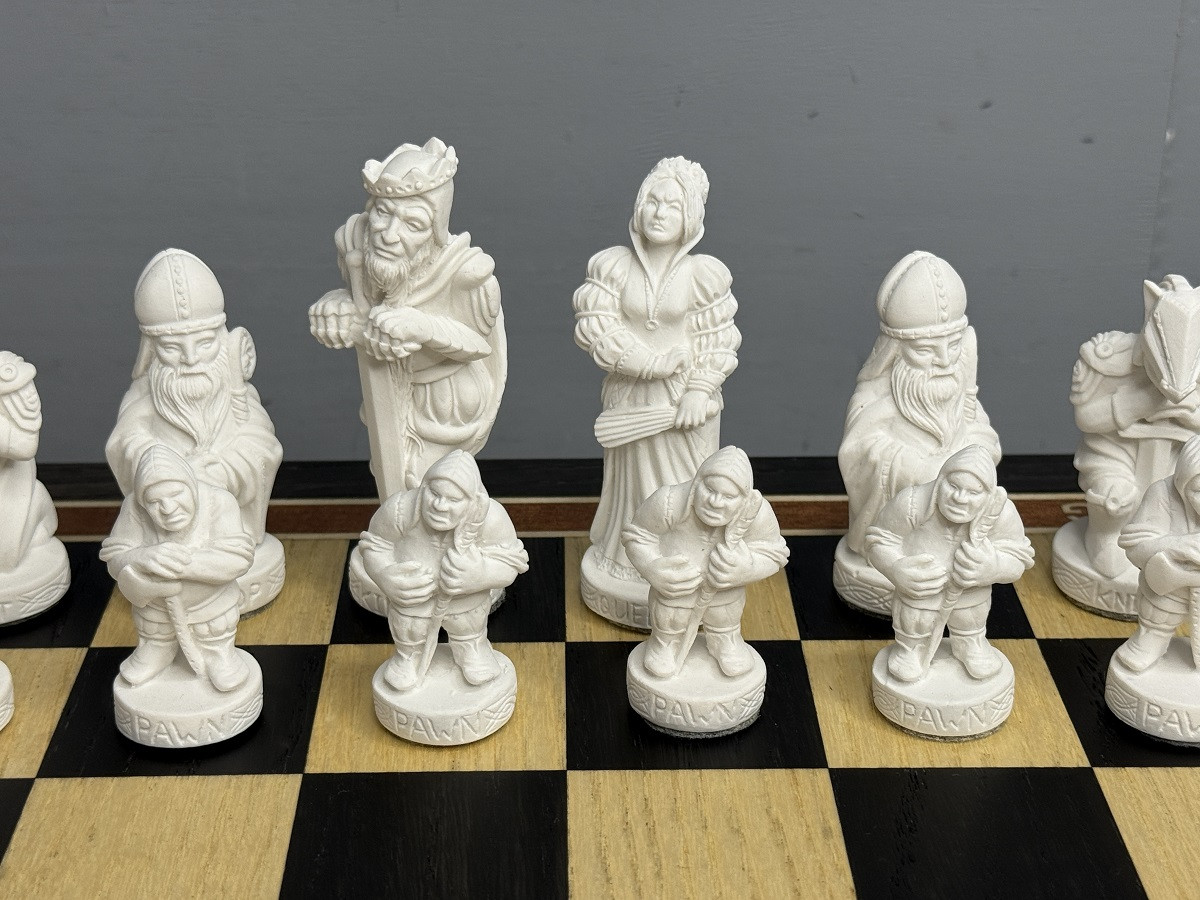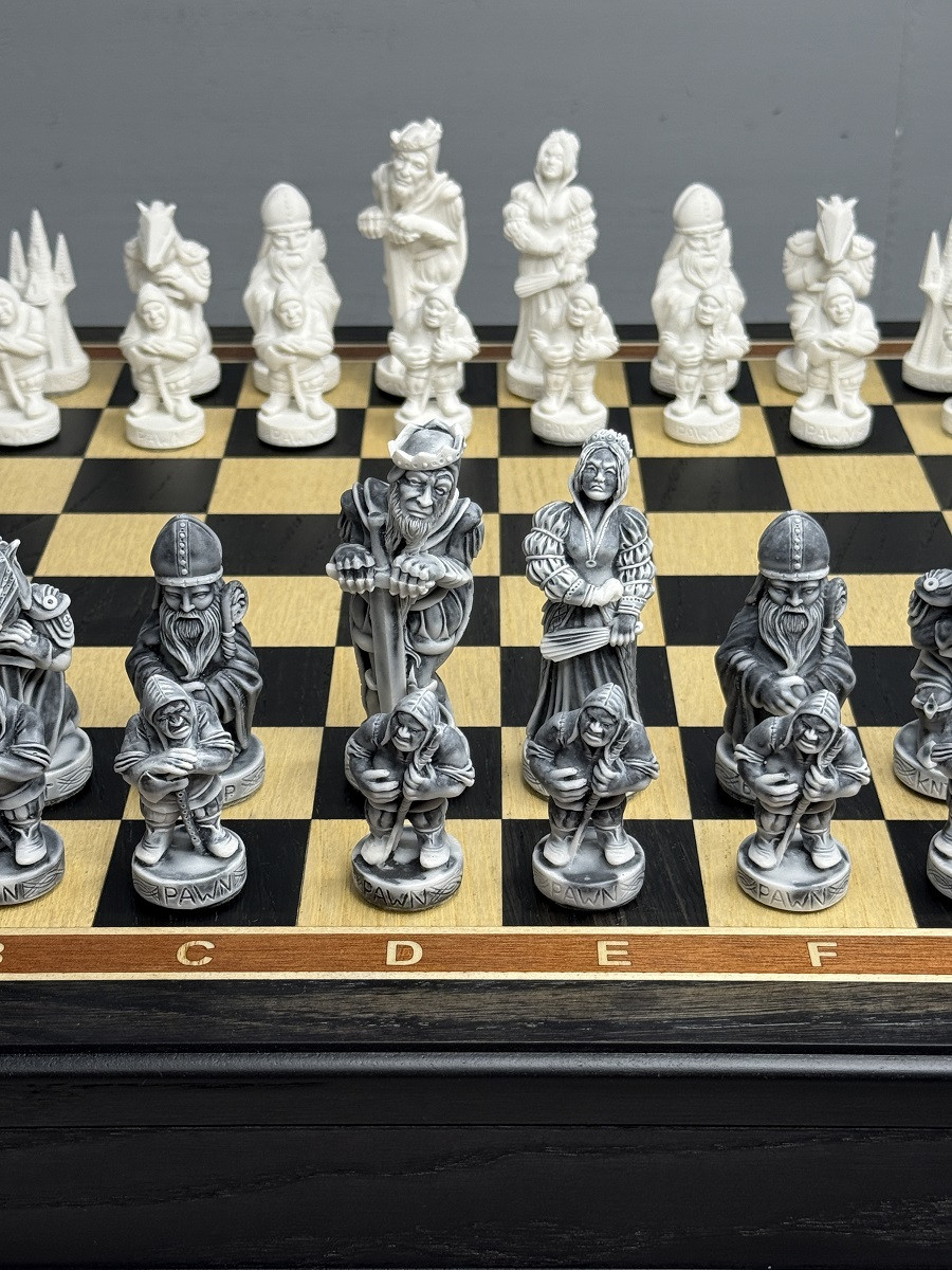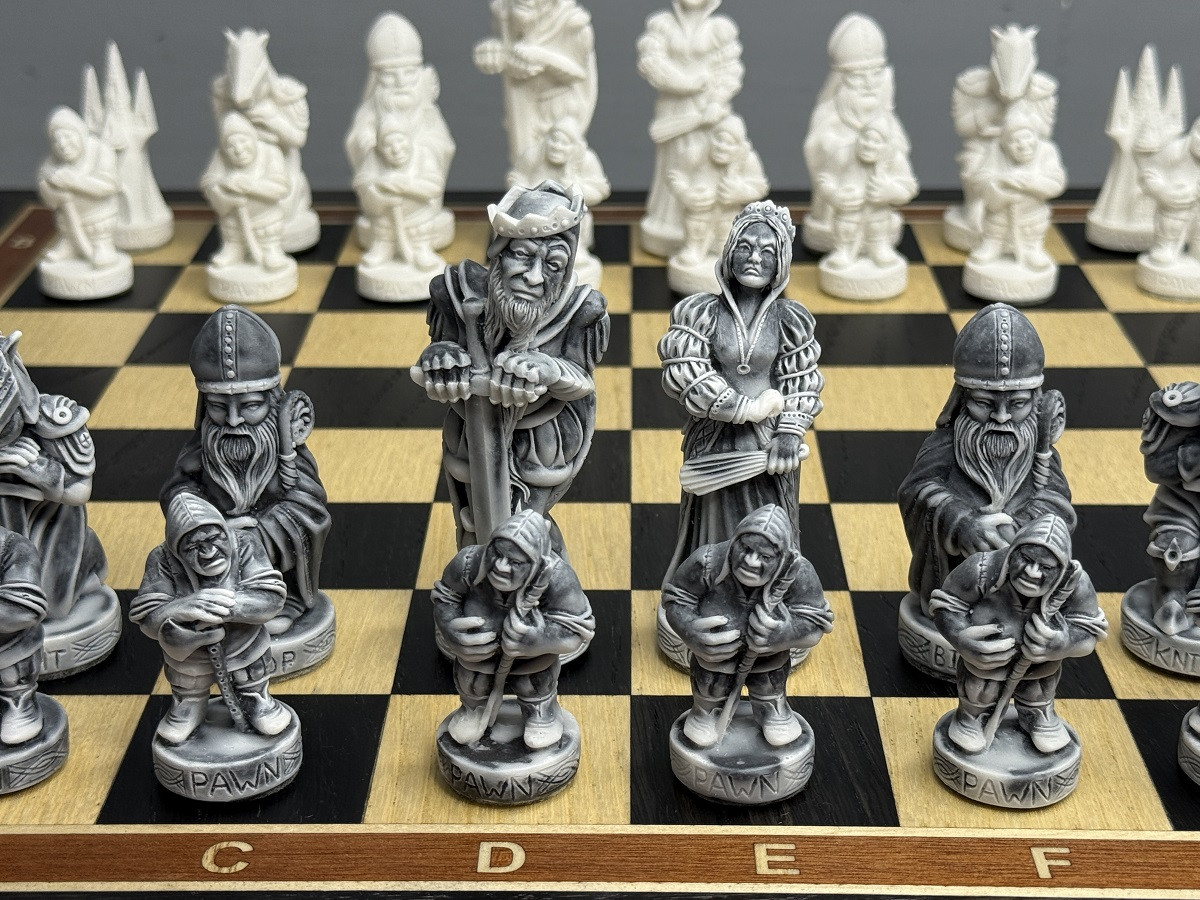 Каждая фигура создана вручную с высокой детализацией. Пешка — 5,2 см, король — 9,5 см. Тематика фигур — средневековые рыцари, что делает набор уникальным и коллекционным.
