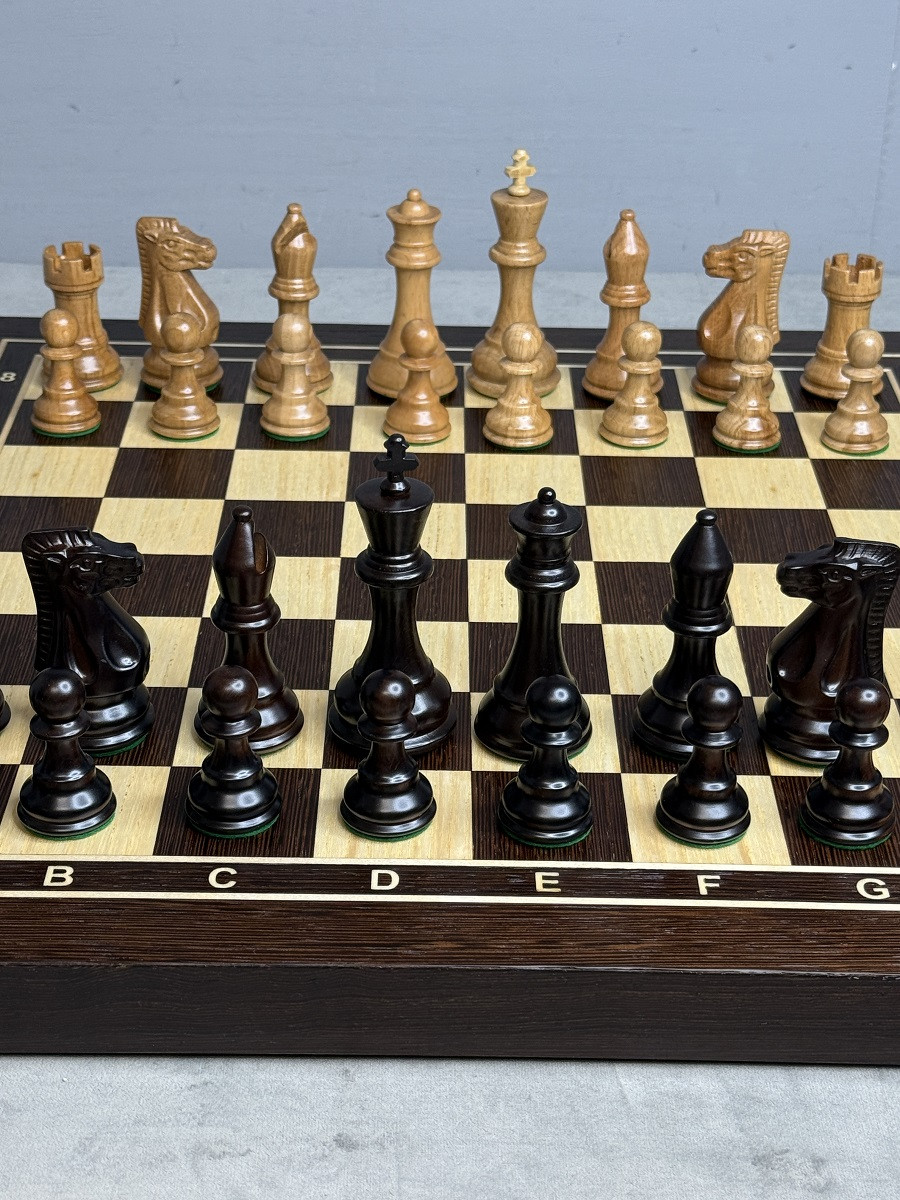 доска 40х40х3 см, клетка 4,5х4,5 см, высота фигур: пешка 6 см, король 11,5 см
