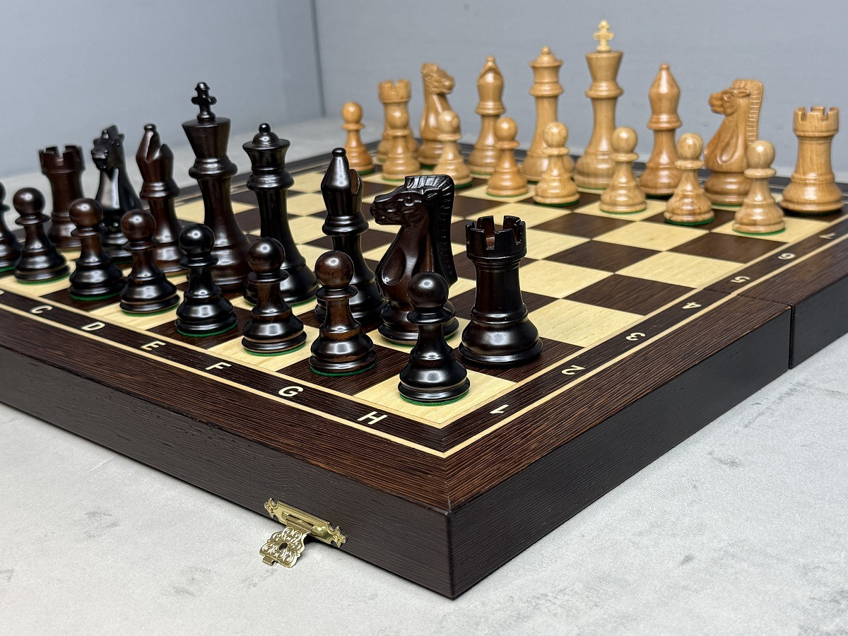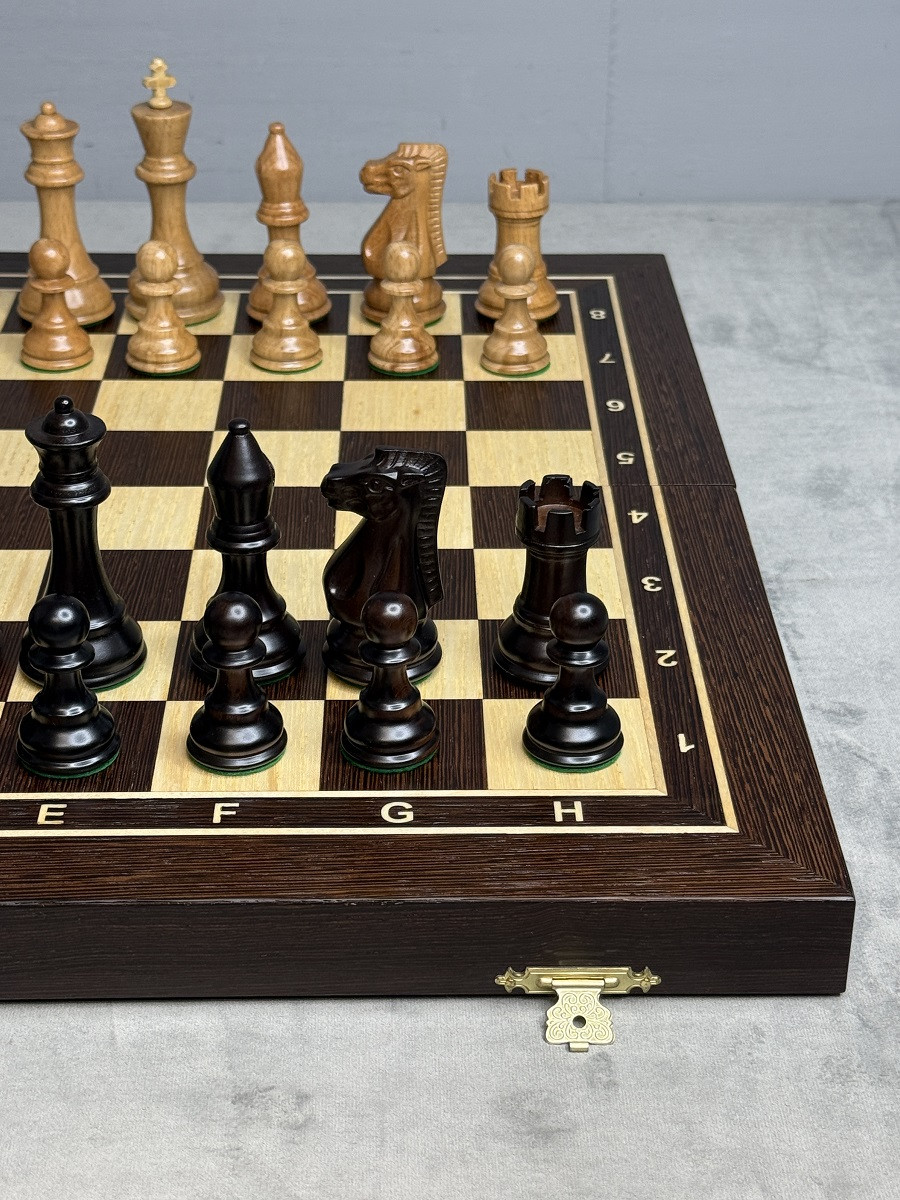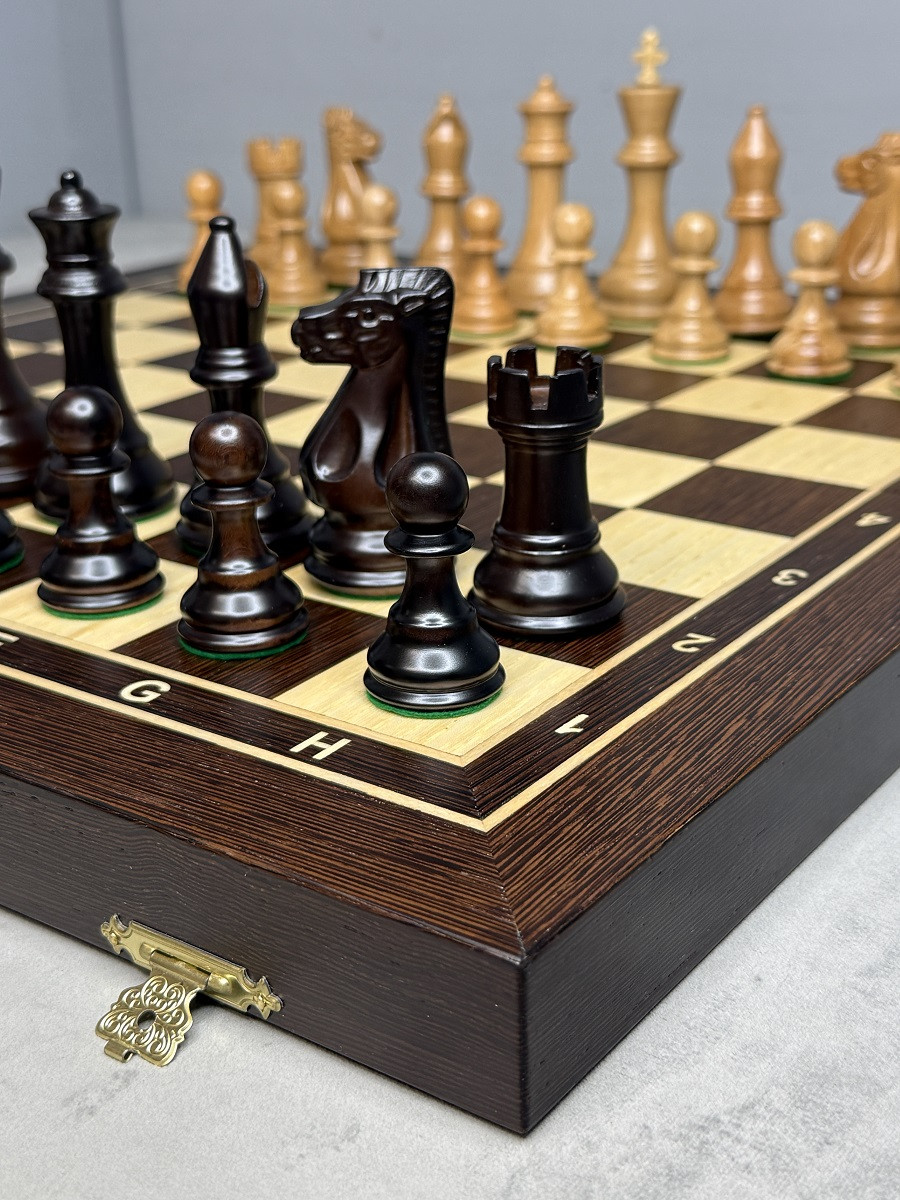 Идеальный набор для настоящих ценителей шахмат! Доска из массива дуба с клетками: светлая – ясень, тёмная – дуб. Классические фигуры с утяжелением, высота короля 10 см, пешки 5 см. Техника ручной работы – маркетри. Отлично подходит в подарок, для коллекции или турнирной игры. Доставка по Москве и всей России.