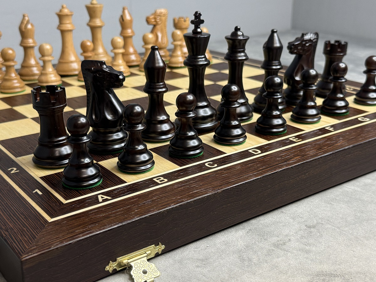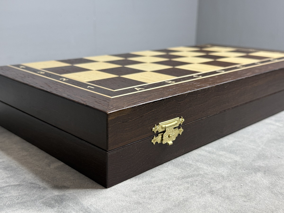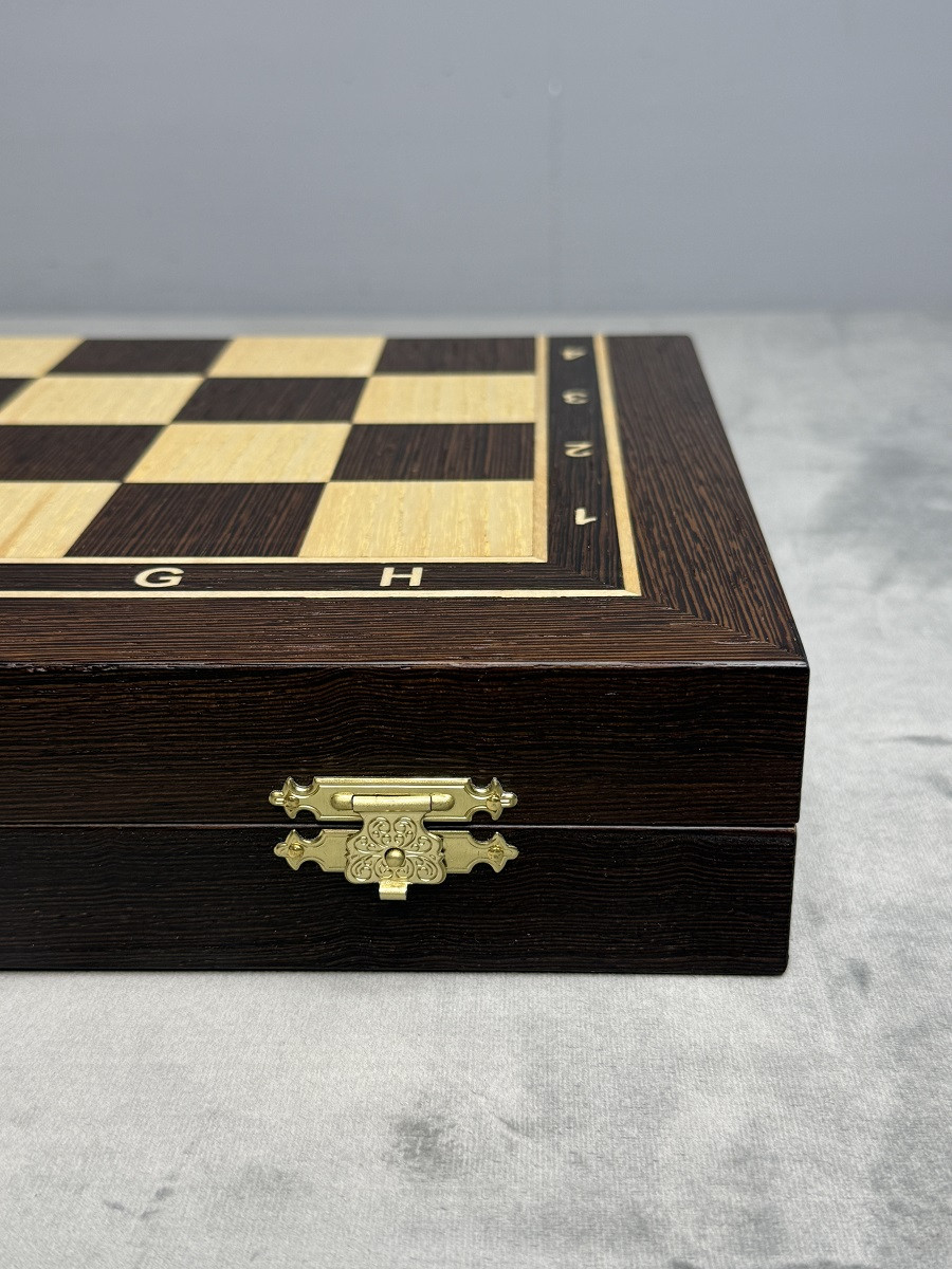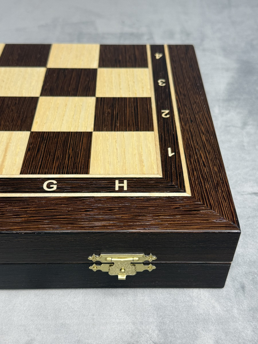 Доска складная, удобная для хранения и транспортировки. Внутри предусмотрено пространство для размещения фигур. Светлая клетка выполнена из ясеня, благодаря чему шахматное поле выглядит особенно красиво и дорого.