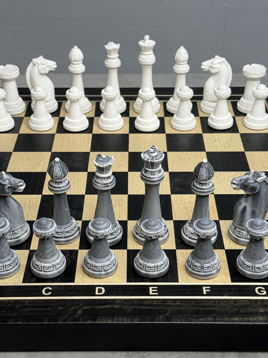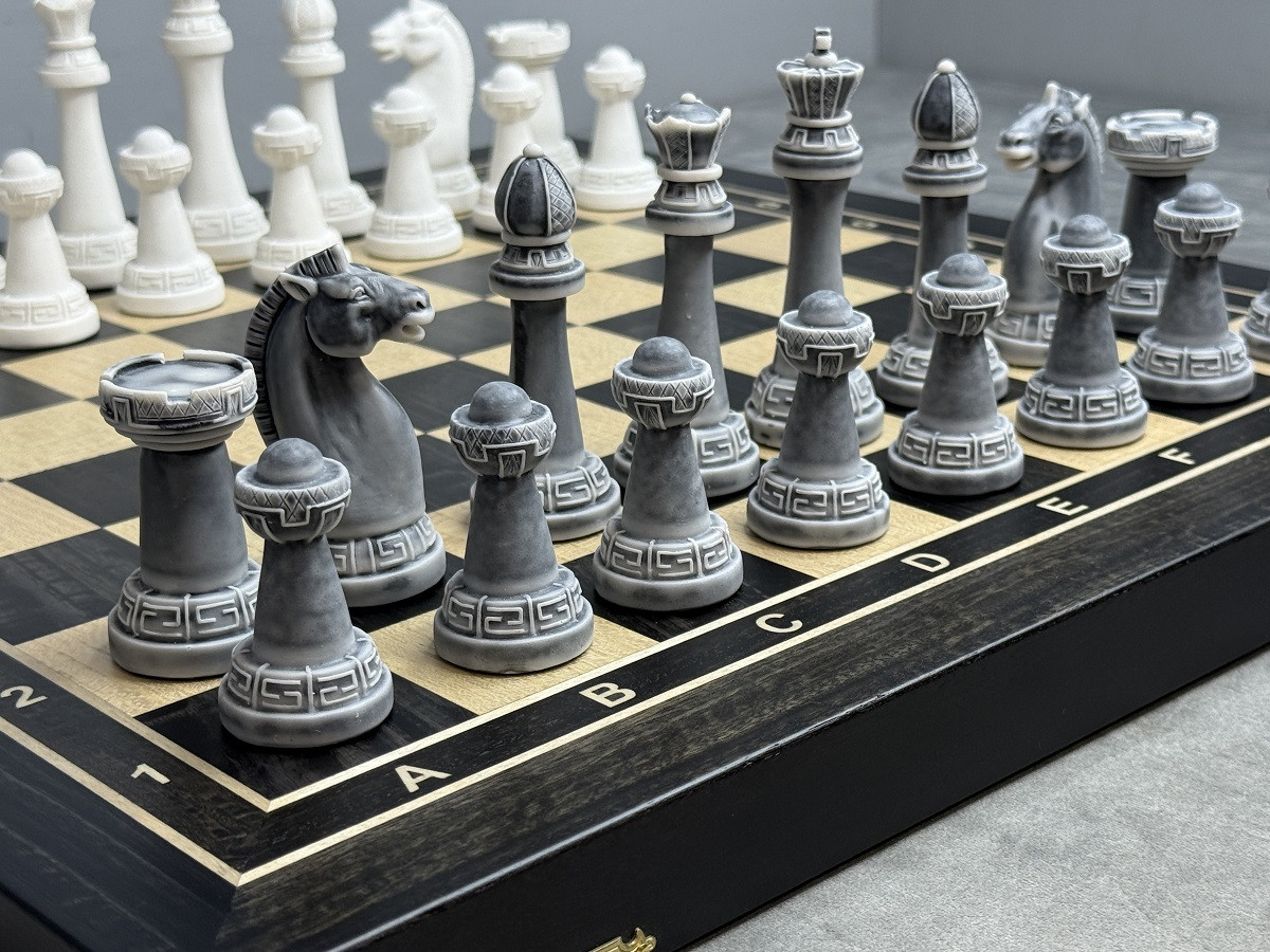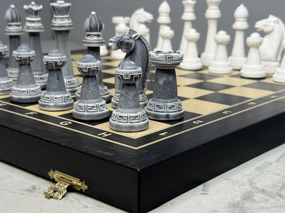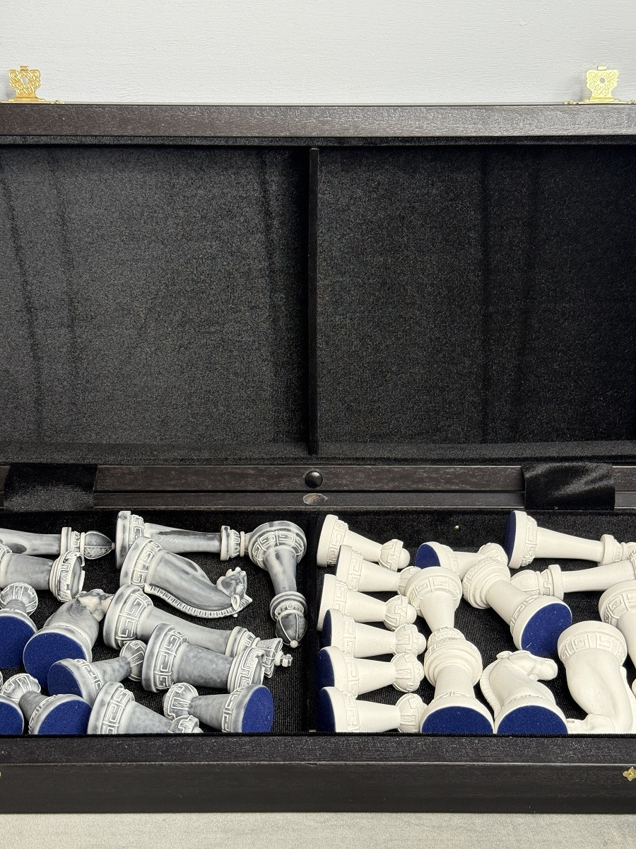 Главная изюминка комплекта — фигуры из литьевого мрамора в дизайне Стаунтон. Они имеют благородный «каменный» вид, приятный вес и аккуратный декоративный узор на основании. Такие фигуры смотрятся особенно красиво на тёмной доске.