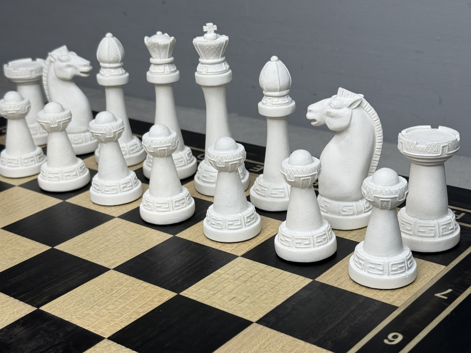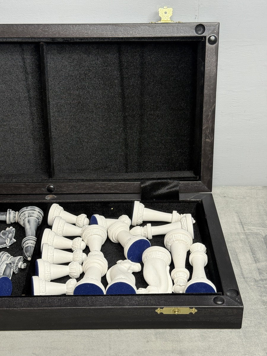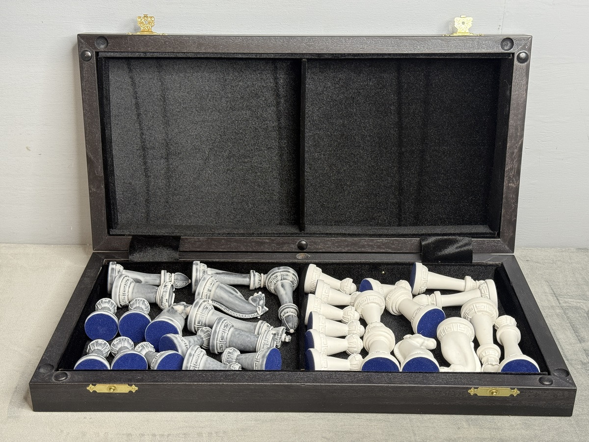 Главная изюминка комплекта — фигуры из литьевого мрамора в дизайне Стаунтон. Они имеют благородный «каменный» вид, приятный вес и аккуратный декоративный узор на основании. Такие фигуры смотрятся особенно красиво на тёмной доске.
