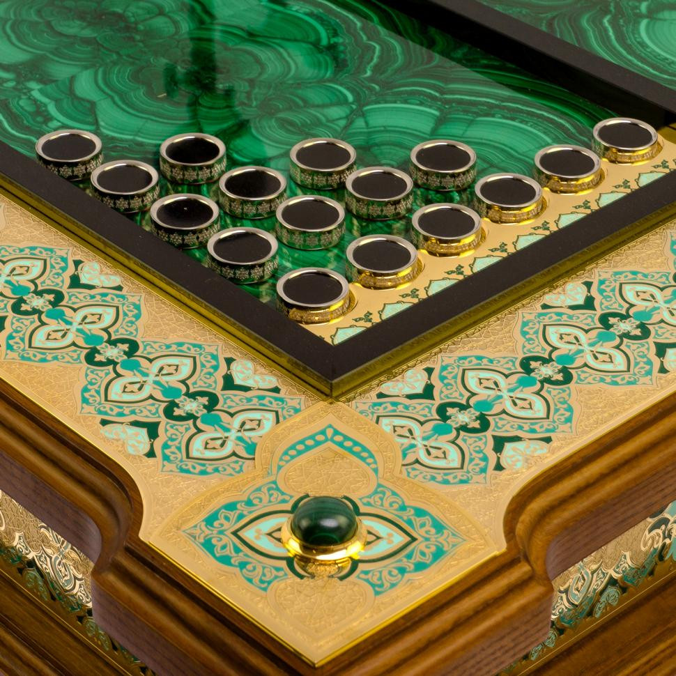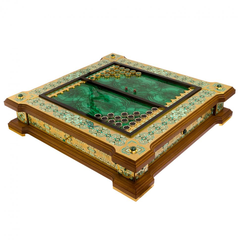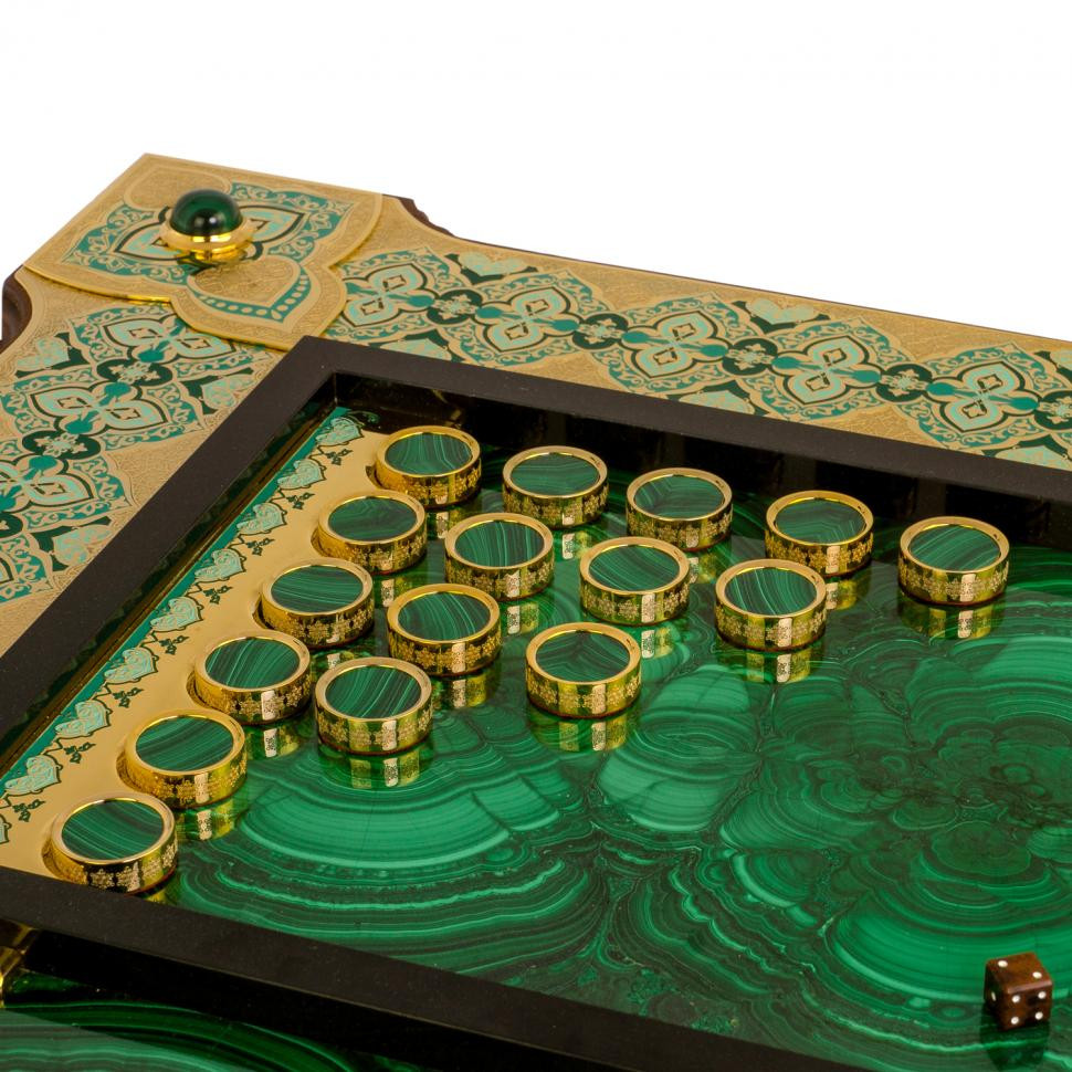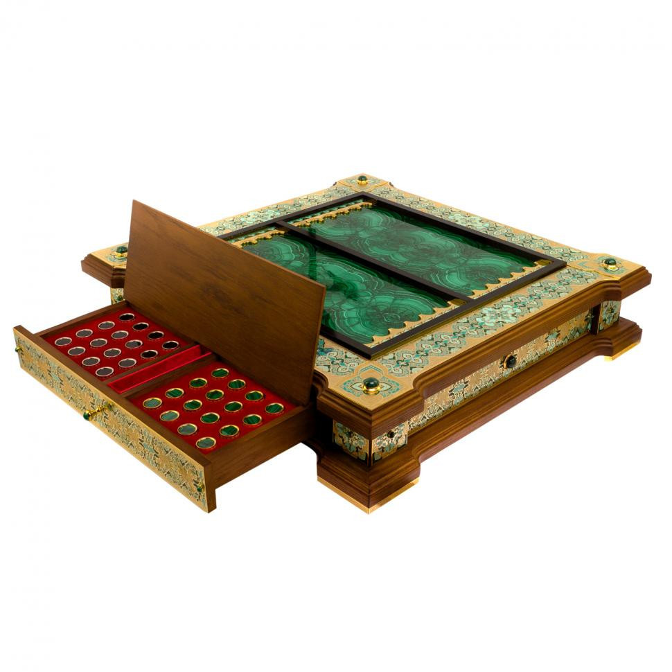 Купить нарды эксклюзивные «Императорский Малахит» — статусный набор ручной работы из натурального малахита, дерева и латуни с златоустовской гравюрой. Премиальная доска 66×66 см, уникальная отделка золотом, никелем и эмалью. Идеальный подарок мужчине и коллекционный предмет.