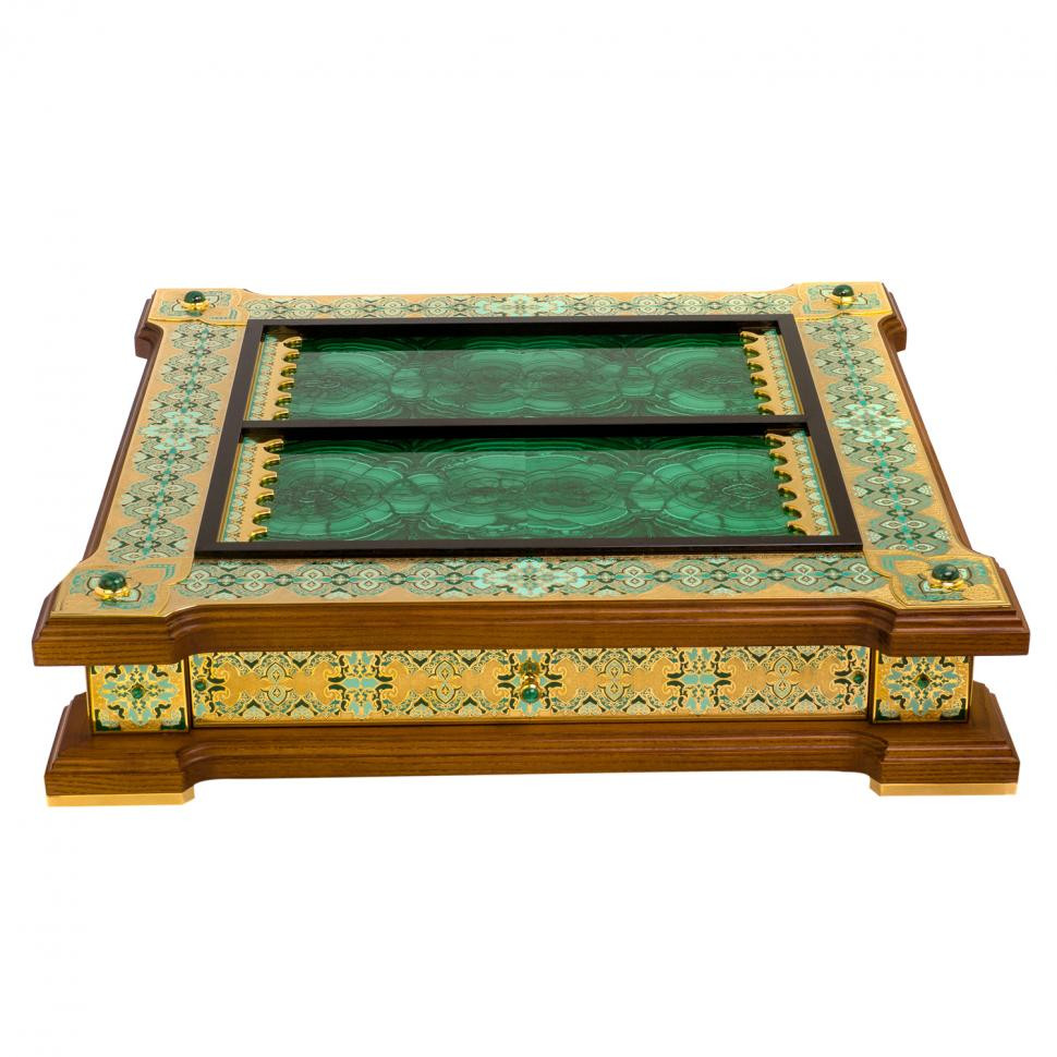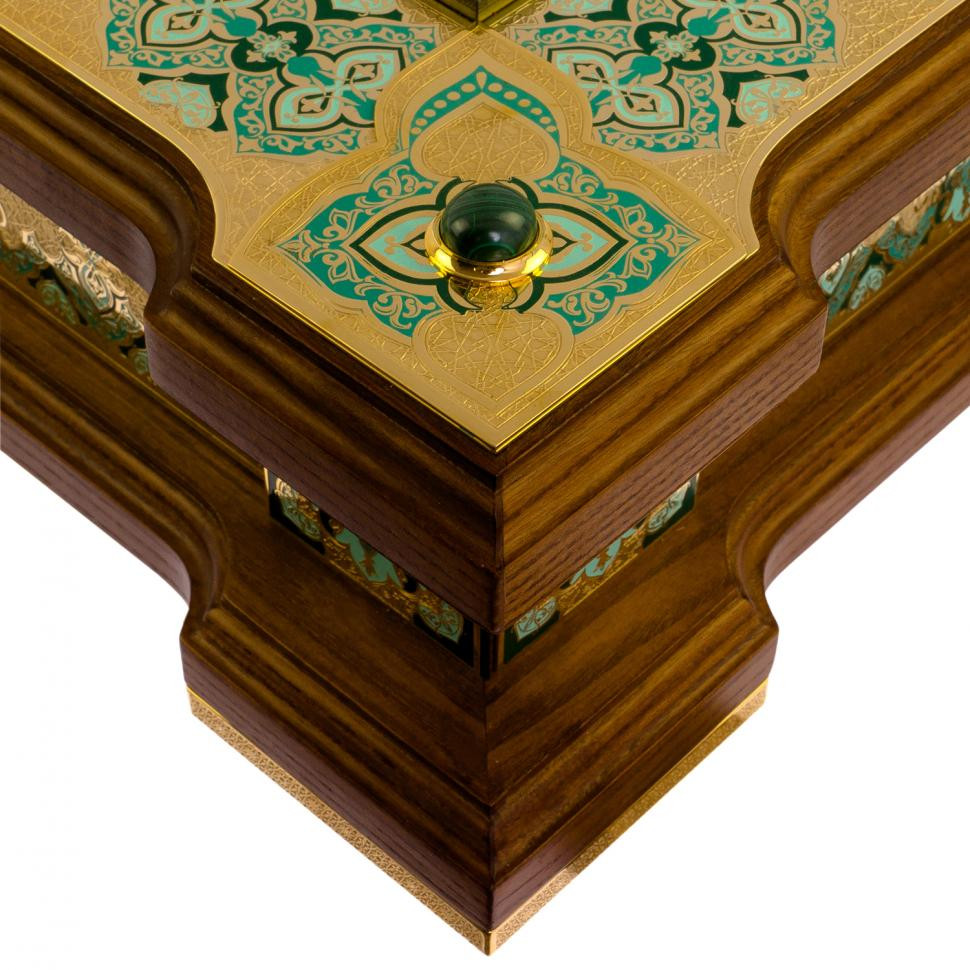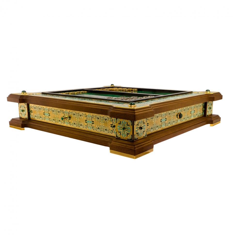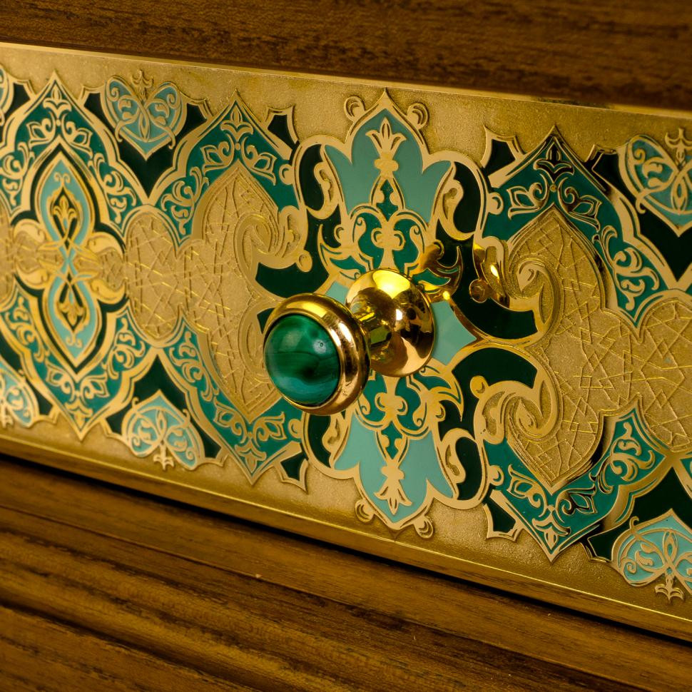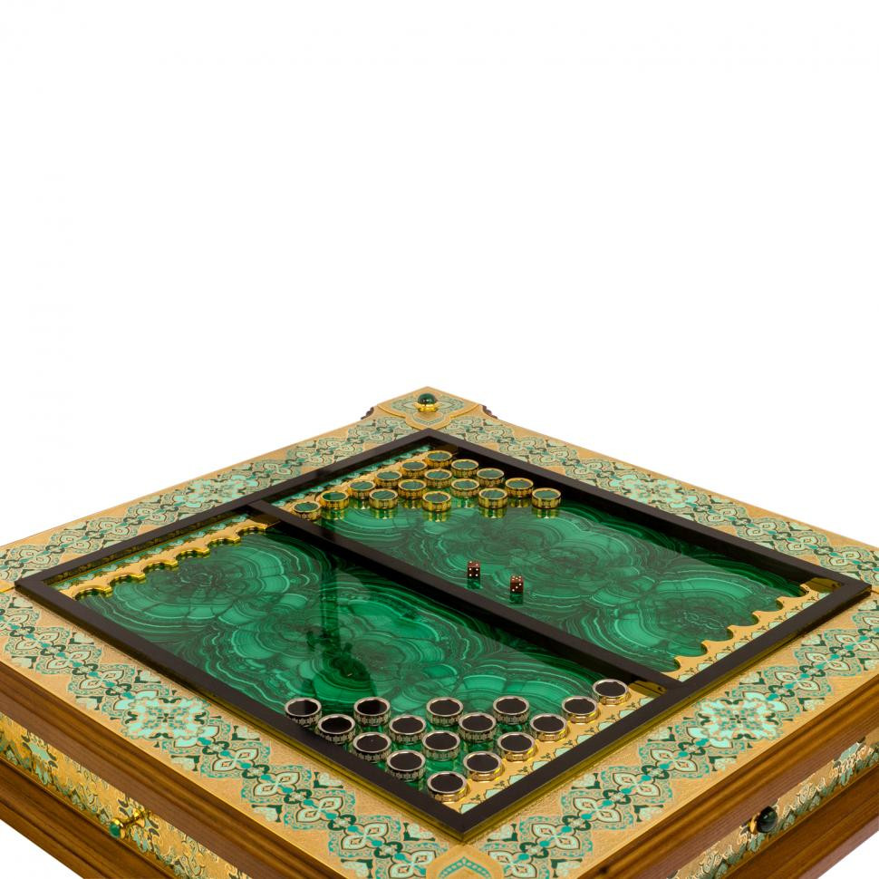 Купить нарды эксклюзивные «Императорский Малахит» — статусный набор ручной работы из натурального малахита, дерева и латуни с златоустовской гравюрой. Премиальная доска 66×66 см, уникальная отделка золотом, никелем и эмалью. Идеальный подарок мужчине и коллекционный предмет.