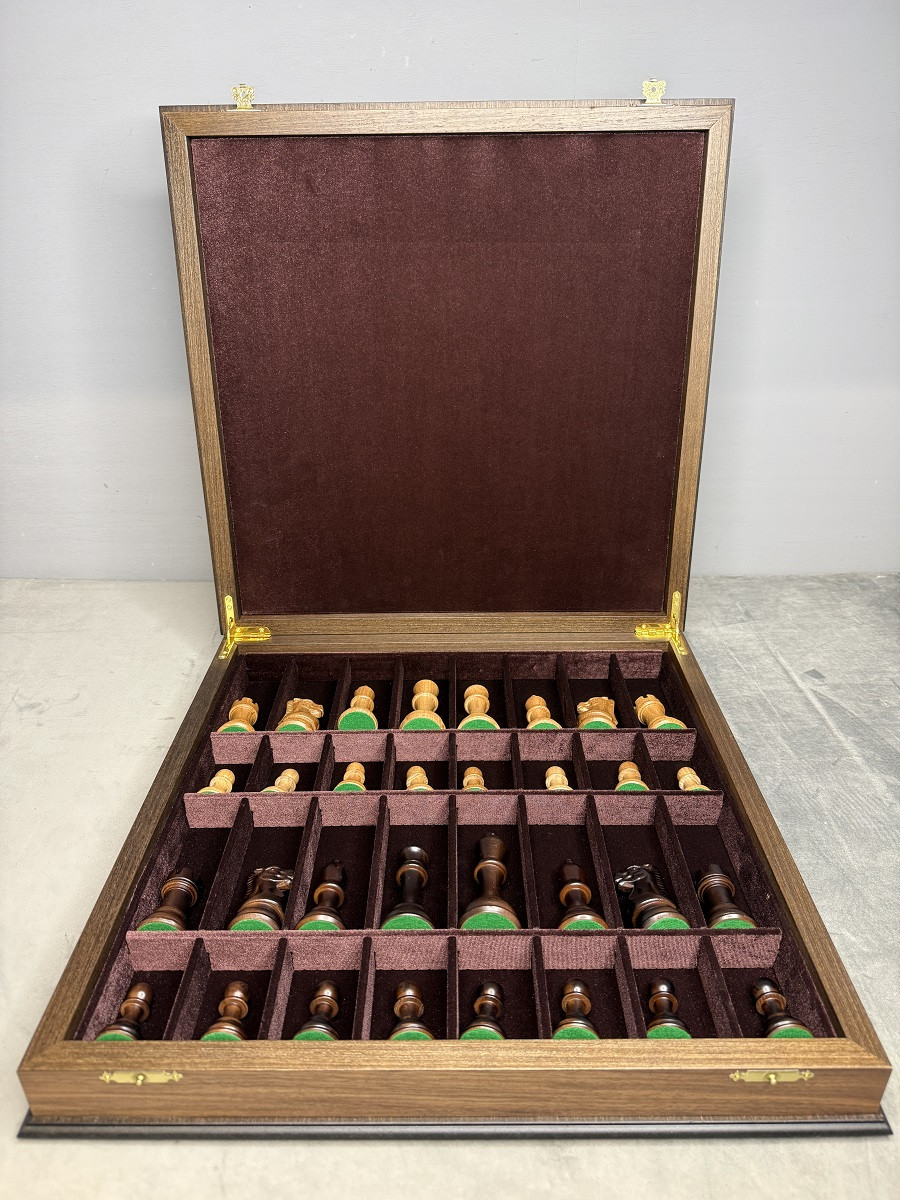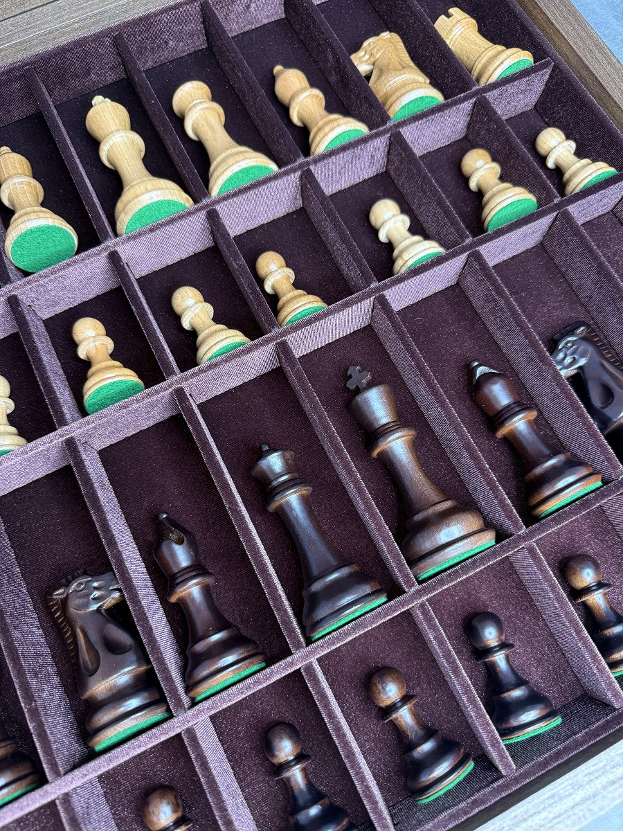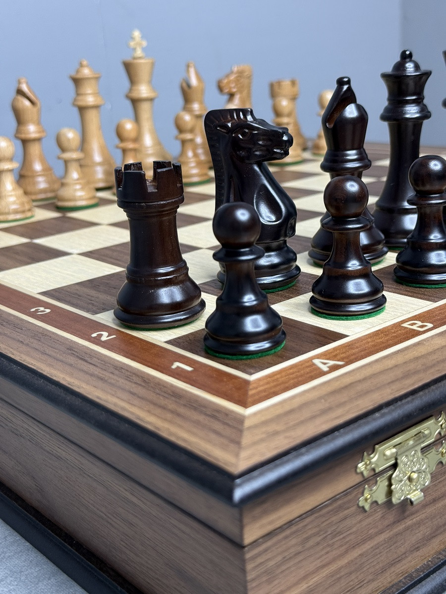 Это консервативный и сдержанный дизайн, где каждая деталь подчинена функциональности и эстетике. Такой ларец выбирают настоящие ценители шахмат, для которых важны глубина, смысл и классический стиль без декоративной перегрузки.