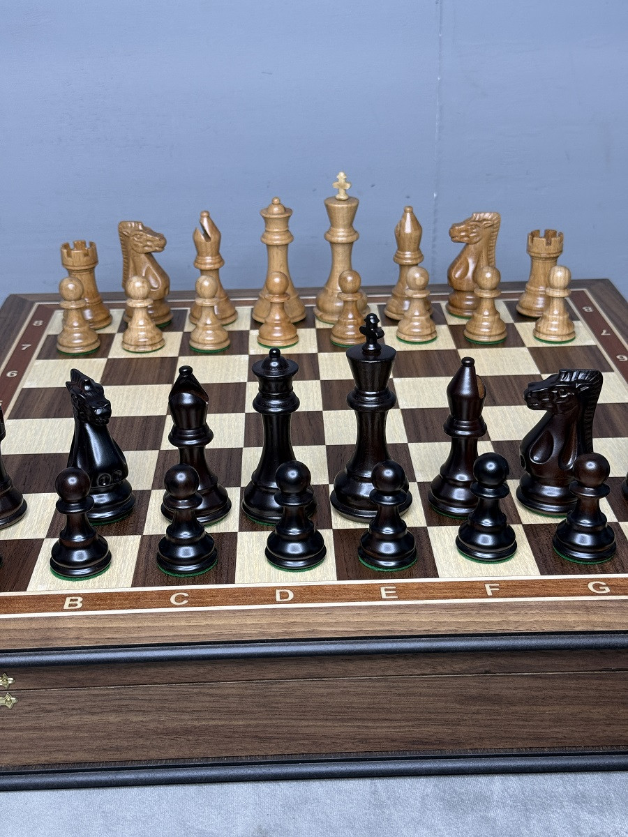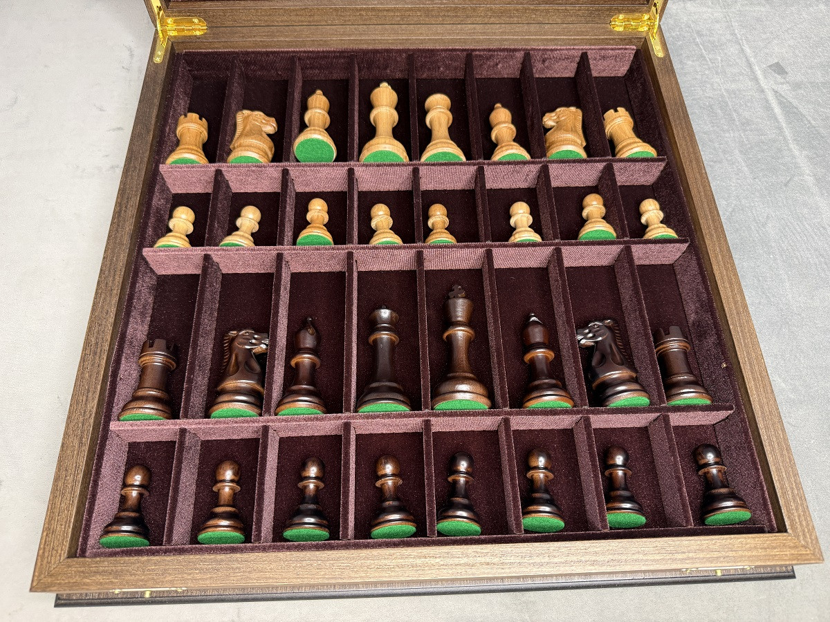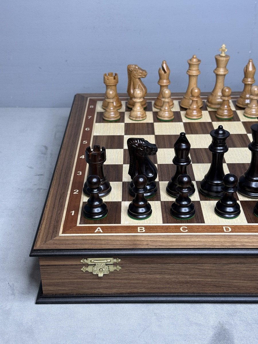 Это консервативный и сдержанный дизайн, где каждая деталь подчинена функциональности и эстетике. Такой ларец выбирают настоящие ценители шахмат, для которых важны глубина, смысл и классический стиль без декоративной перегрузки.