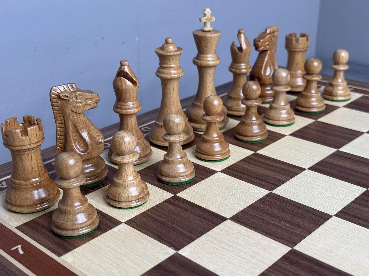 Фигуры: классические Стаунтон, массив дуба, высота короля 10 см, высота пешки 5 см, утяжелённые, с подклейкой основания