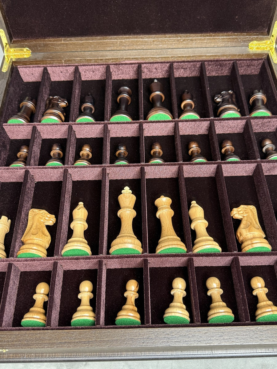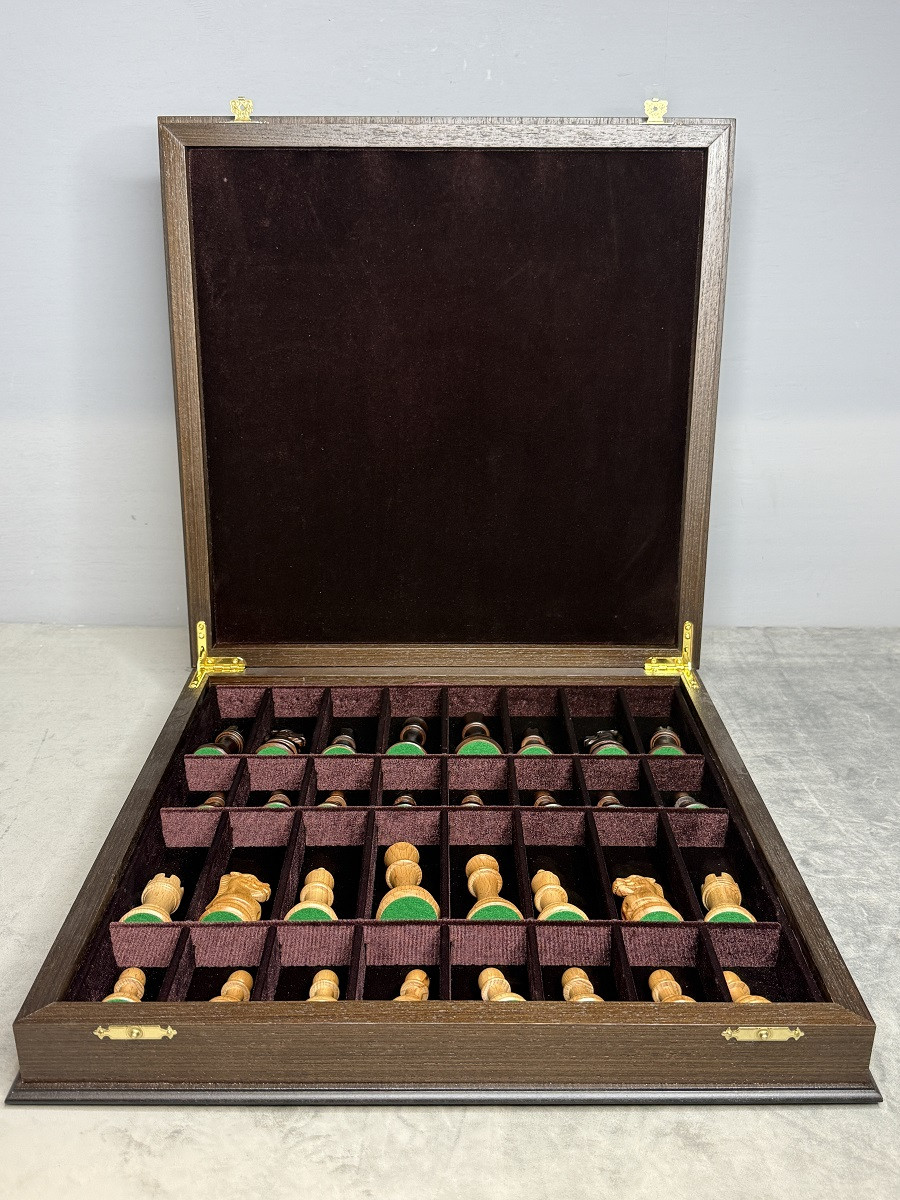 Внутри ларца предусмотрены аккуратные бархатные ячейки для хранения шахматных фигур. Ячейки подходят для фигур с диаметром основания до 4 см. Ларец закрывается на два замочка, надёжно фиксируя крышку и защищая содержимое при перевозке.