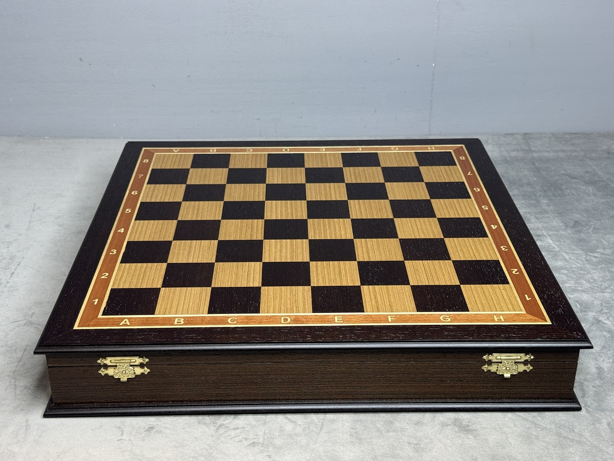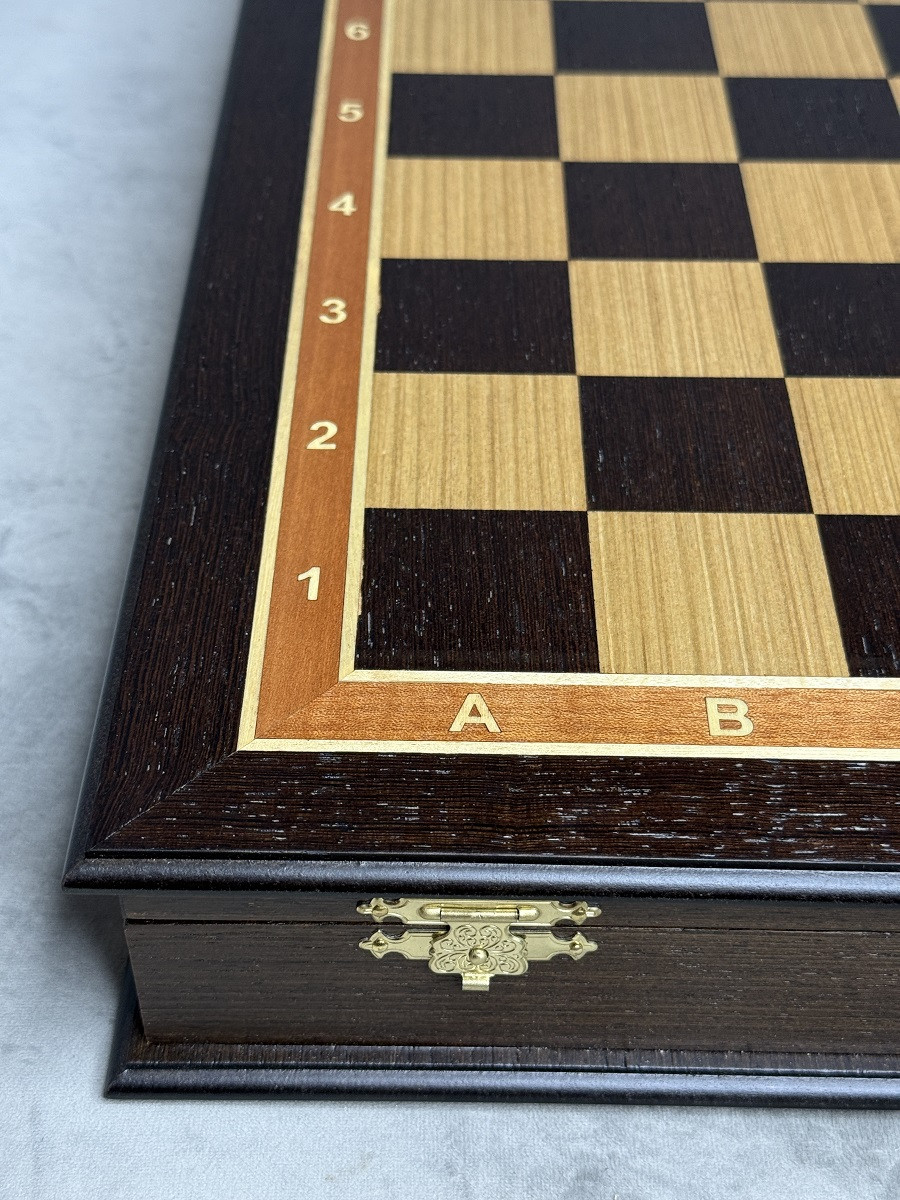 Шахматное поле изготовлено в технике маркетри — изысканная сборка из натурального дерева венге и дуба, благодаря чему доска выглядит статусно и дорого. Поверхность покрыта матовым лаком, который подчёркивает текстуру дерева и защищает игровое поле от повреждений.