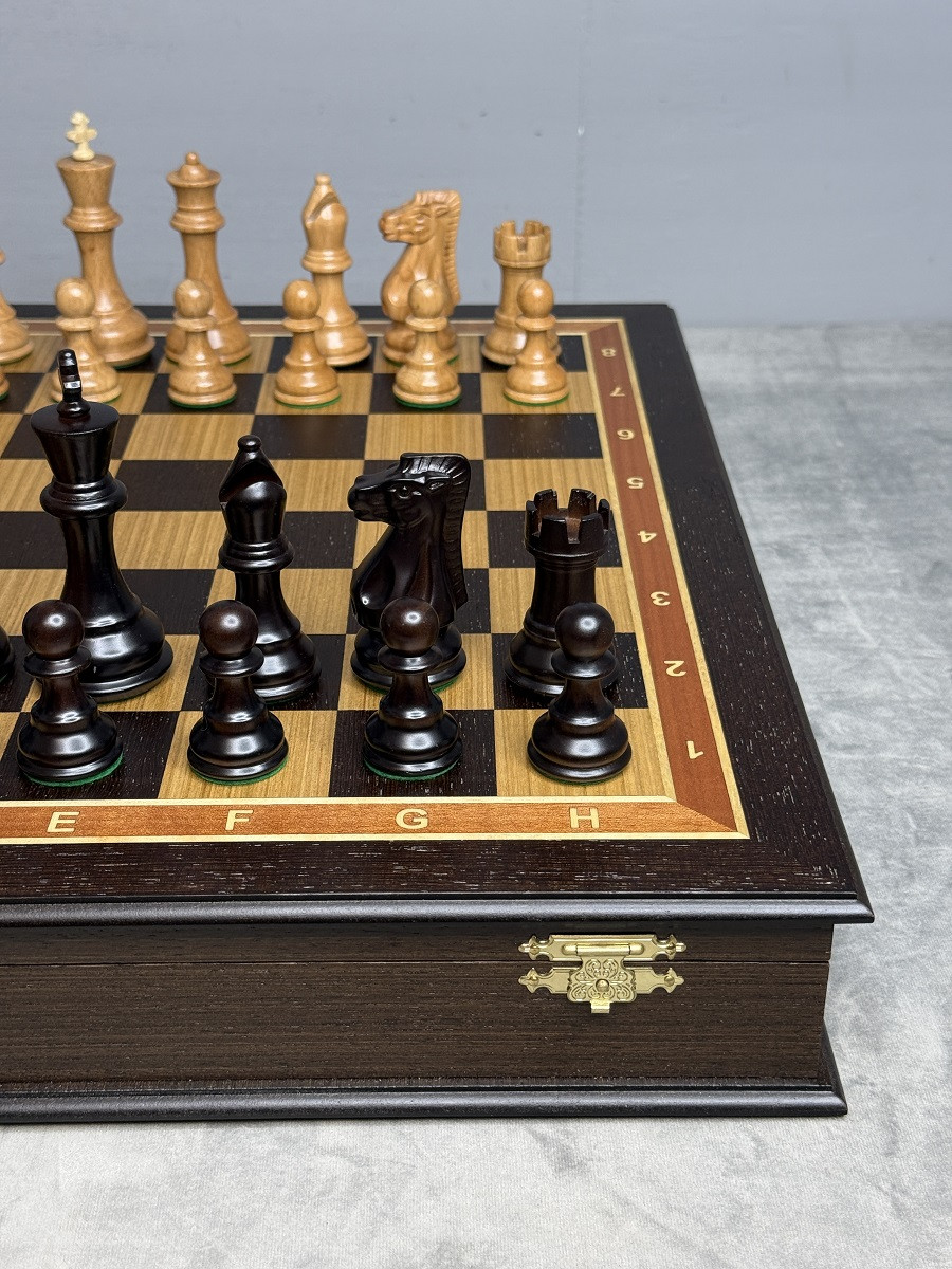 Подарочные шахматы «Дубовый король» в ларце — премиальный набор из венге и дуба с игровым полем маркетри. Ларец с бархатными ячейками для хранения фигур, закрывается на 2 замочка. Фигуры из натурального дуба в стиле Стаунтон, утяжелённые. Размер доски 45×45 см, клетка 4,5×4,5 см. Производство Россия.