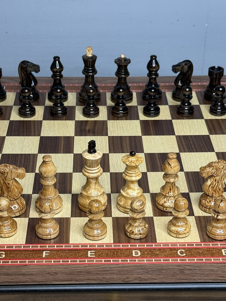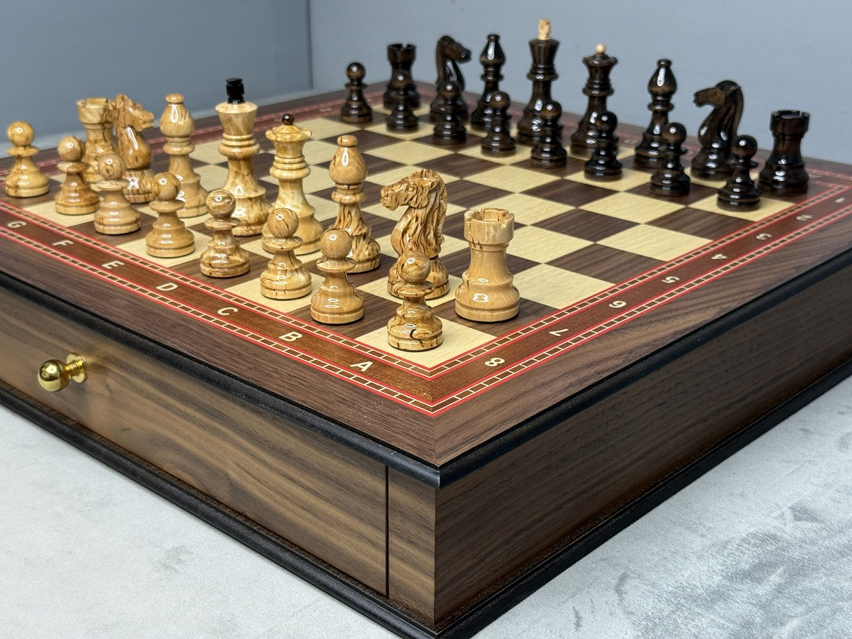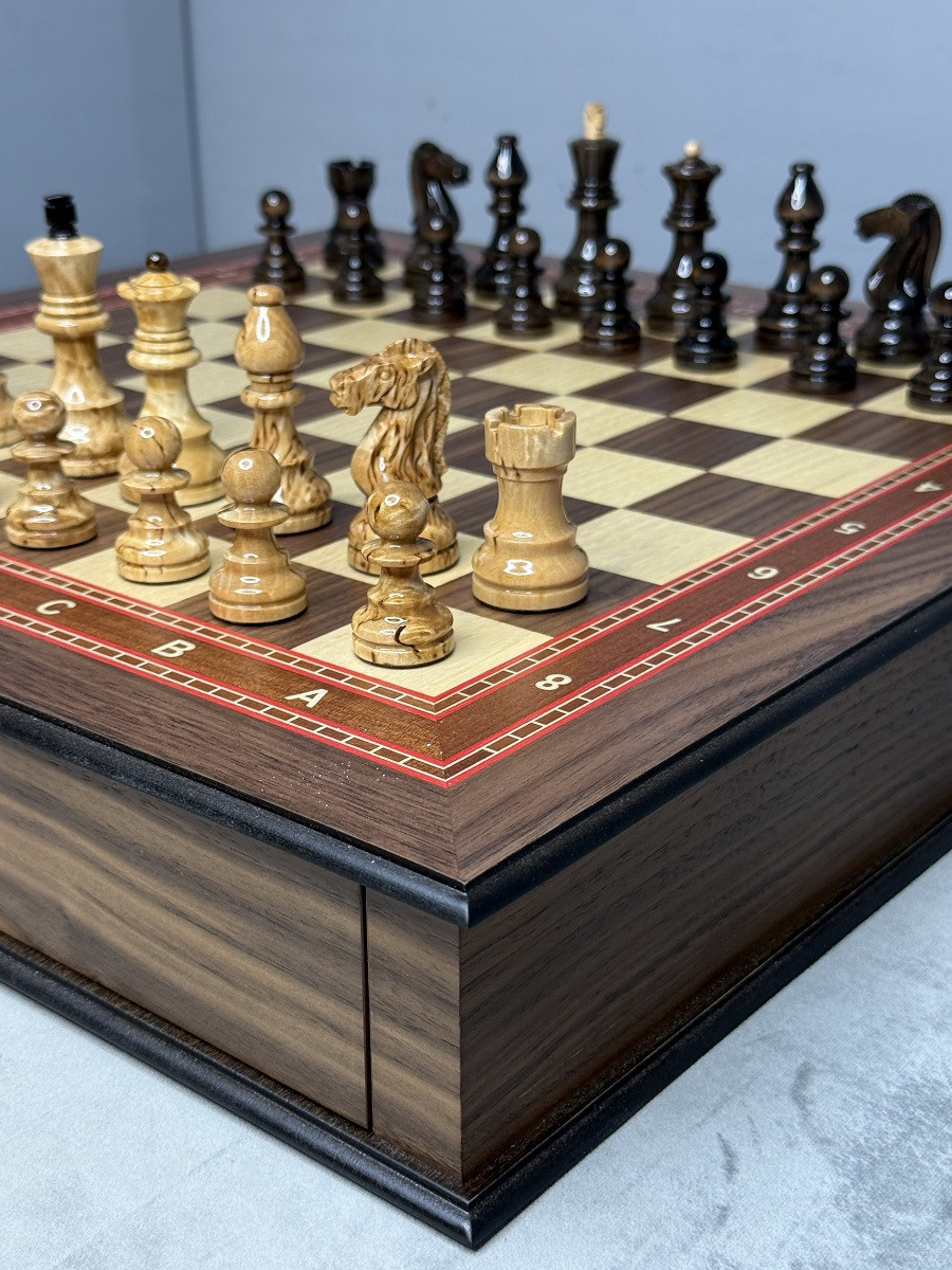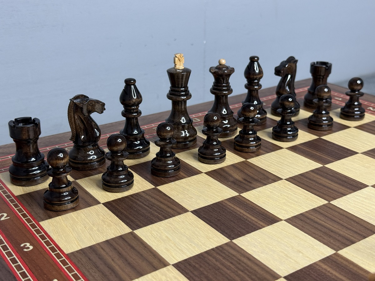 Игровая доска изготовлена из натурального ореха и ясеня. Размер клетки составляет 4,5 × 4,5 см, что делает игру комфортной и удобной как для новичков, так и для опытных игроков.