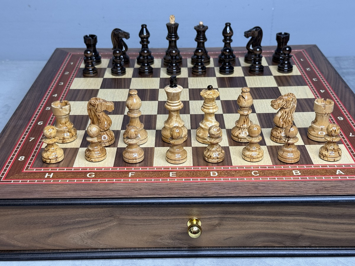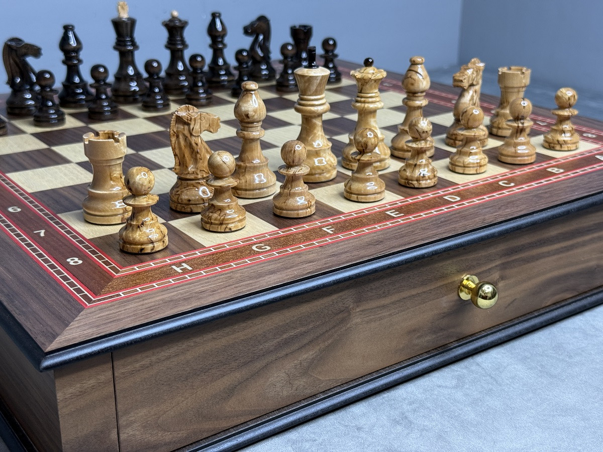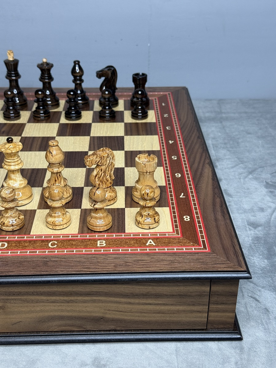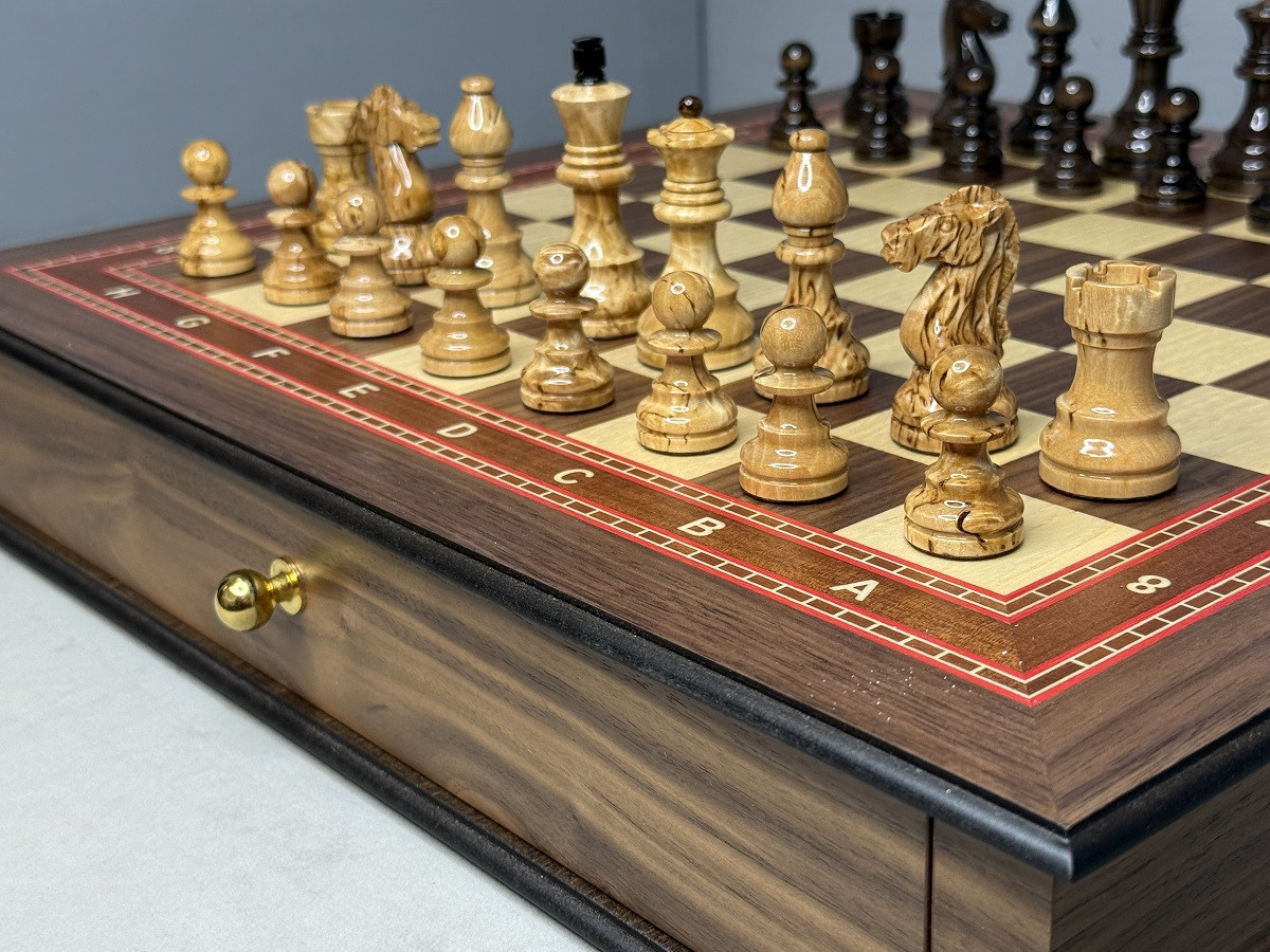 Шахматный набор выполнен в виде массивного ларца с двумя выдвижными ящиками для хранения фигур. Каждый ящик оснащён бархатными ячейками, которые защищают фигуры от повреждений и обеспечивают аккуратное хранение.