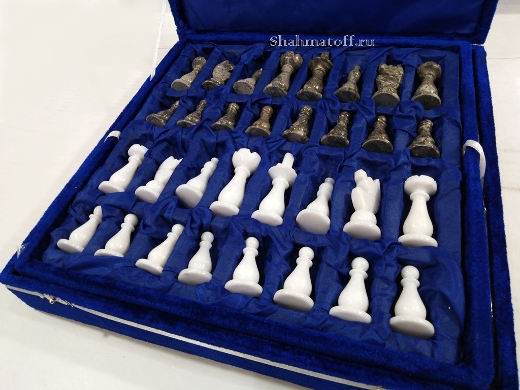 Шахматная доска находится в бархатном подарочном футляре с индивидуальным местом под каждую фигуру.