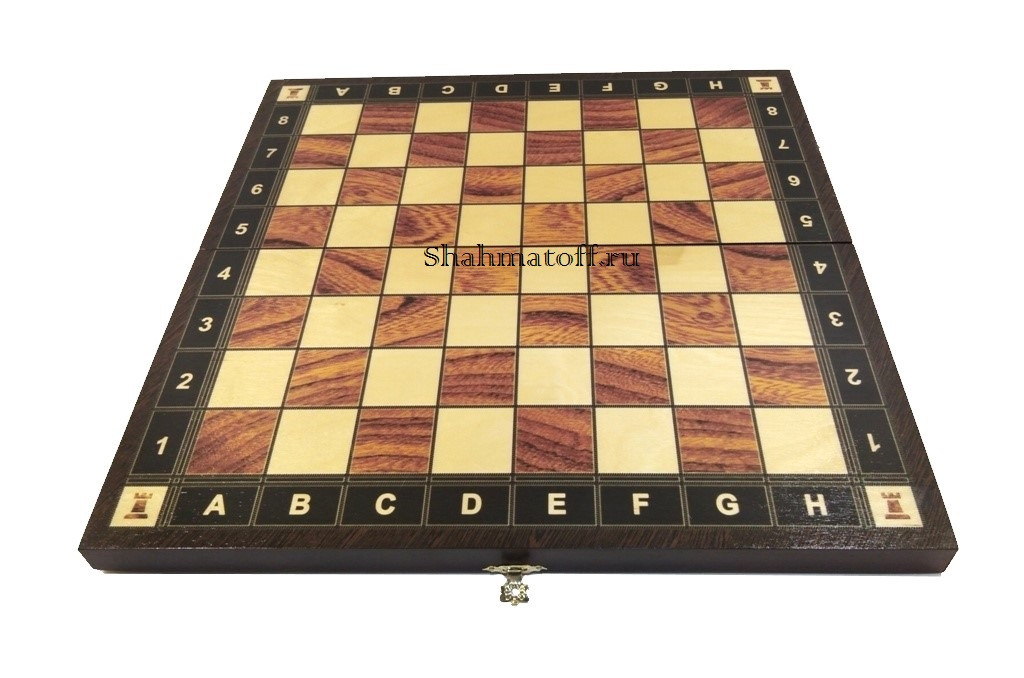 Специфика выполнения доски: каркас доски изготовлен из лиственницы и подвержен дополнительной тепловой обработке с целью исключения выгибаний и деформаций при ёё дальнейшей эксплуатации. Игровое поле нанесено методом лазерной фотопечати, что позволяет увеличить срок службы поверхности, а также сохранить текстуру дерева. Внутри доски бархатный ложемент под шахматные фигуры.