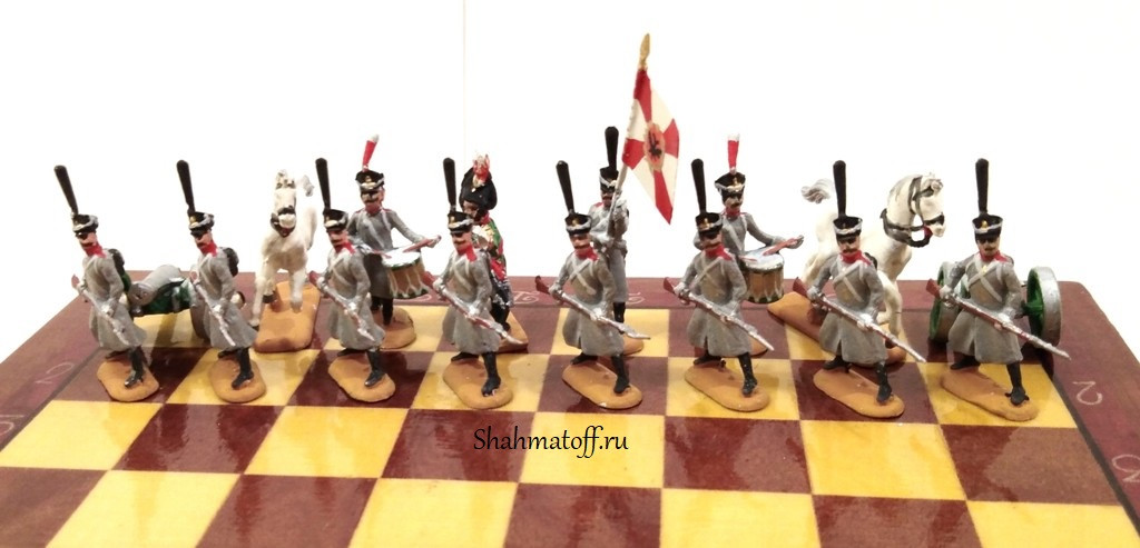 Шахматный фигуры: фигуры изготовлены из олова и расписаны мастером вручную. Несмотря на свой небольшой размер, каждая фигурка из цветного металла приятно ощущается в руке и радует глаз точностью литья деталей и росписи.