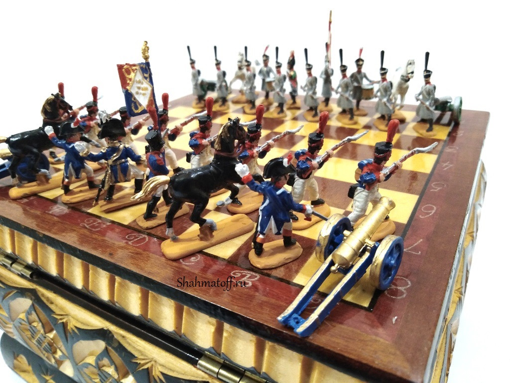 Шахматный ларец: ларец изготовлен из массива твердых пород деревьев и украшен ручной резьбой мастера. Игровое поле выполнено с помощью техники маркетри шпоном ценных пород деревьев: орех, красное дерево, клён.