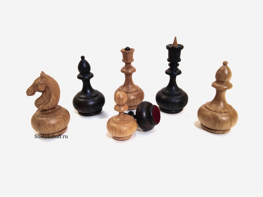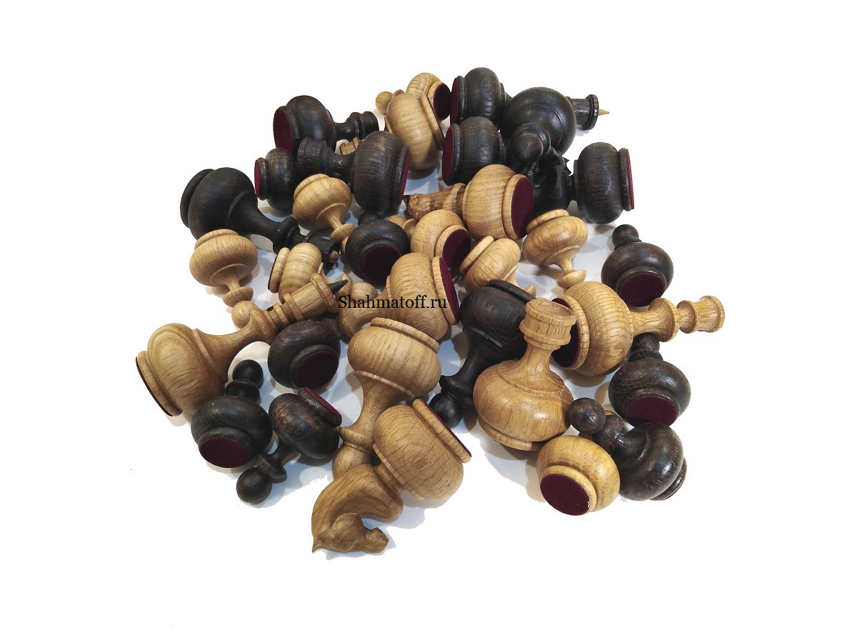 Фигуры изготовлены из дуба методом станочной резьбы и окрашены с сохранением природной текстуры дерева. На завершающем этапе комплект покрывается полуматовым лаком, который исключает блики при освещении и придаёт поверхности аккуратный благородный вид.