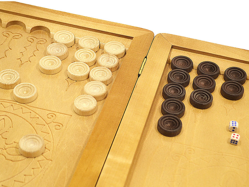 В комплекте: деревянные фишки с элементами ручной росписи по резьбе и бархатной подклейкой, игровые кубики 2 шт. + 2 шт. запасных, бархатные мешочки под фишки и кубики.
