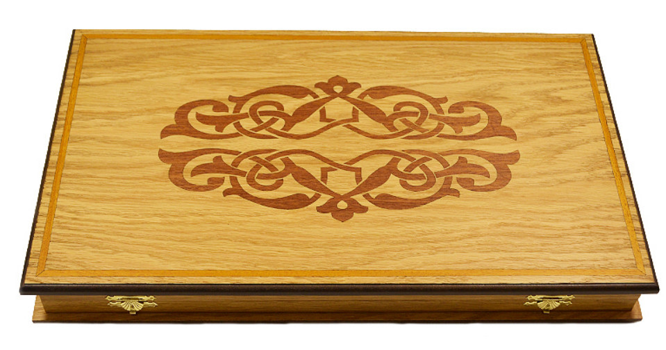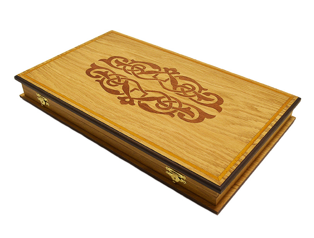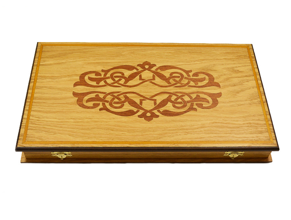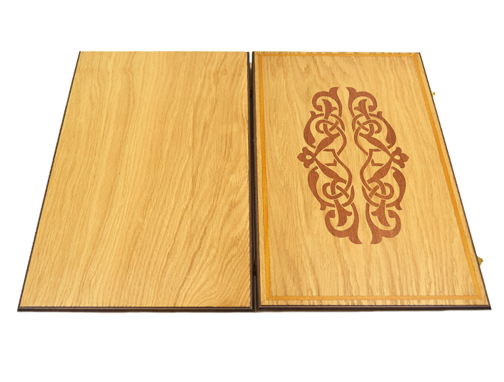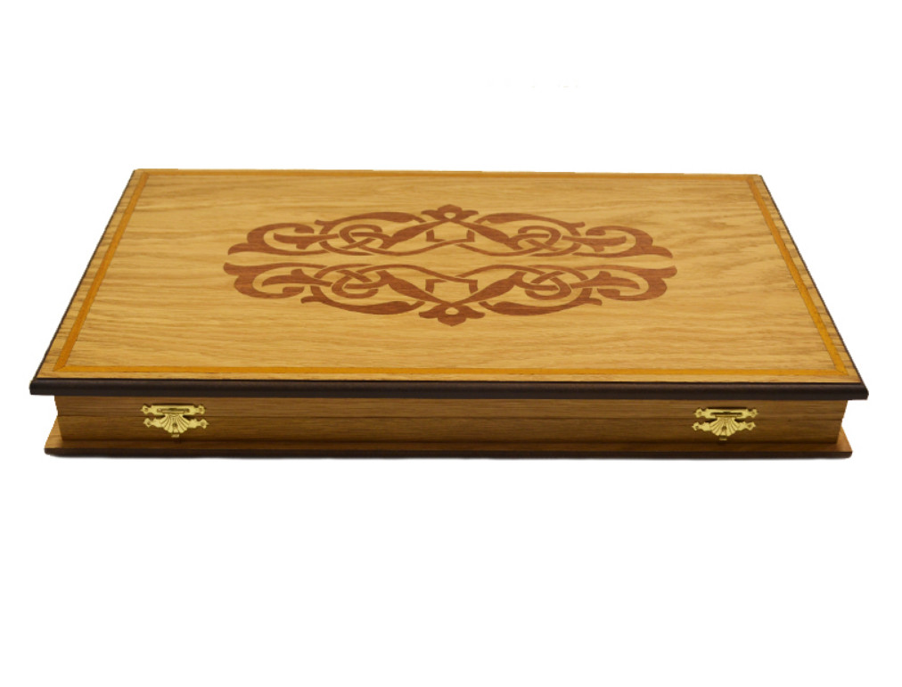 Специфика выполнения доски: поверхность доски, а так же игровое поле выполнены путём инкрустации шпоном красного дерева, надёжные петли и замочки из нержавеющей сувенирной стали.