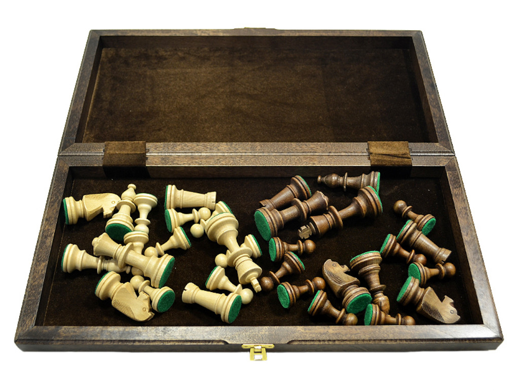 Техника выполнения и обработки фигур: шахматные фигуры выполнены в профессиональном дизайне Стаунтон, утяжелены и имеют в основании тканевую подклейку, что позволяет обеспечить сохранность игрового поля. Покрытие фигур полуматовым лаком исключает появление бликов, что придаёт удобство во время игры.