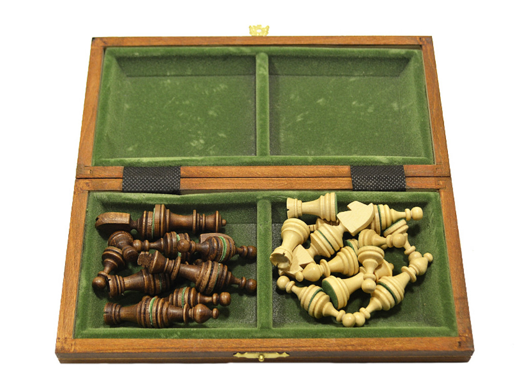 Техника выполнения и обработки фигур: шахматные фигуры вышкурены вручную и покрыты матовым лаком для предотвращения бликов при игре. В основании каждой фигуры встроен магнит, а бархатная подклейка обеспечивает бесшумное передвижение и защиту игрового поля.